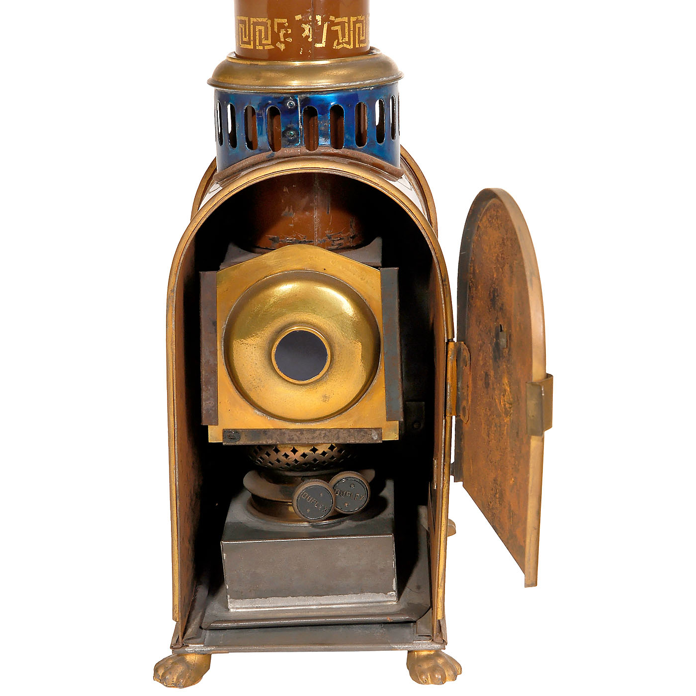 Ernst Plank, Nuremberg. Tin housing, brown lacquer with gilt-transfer decoration, front and glass-holder with semi-transparent blue lacquer, original lens, for lantern slides with height of 2 in., original Duplex burner, height of the lantern 14 ½ in. – Very rare and decorative magic lantern by Plank.