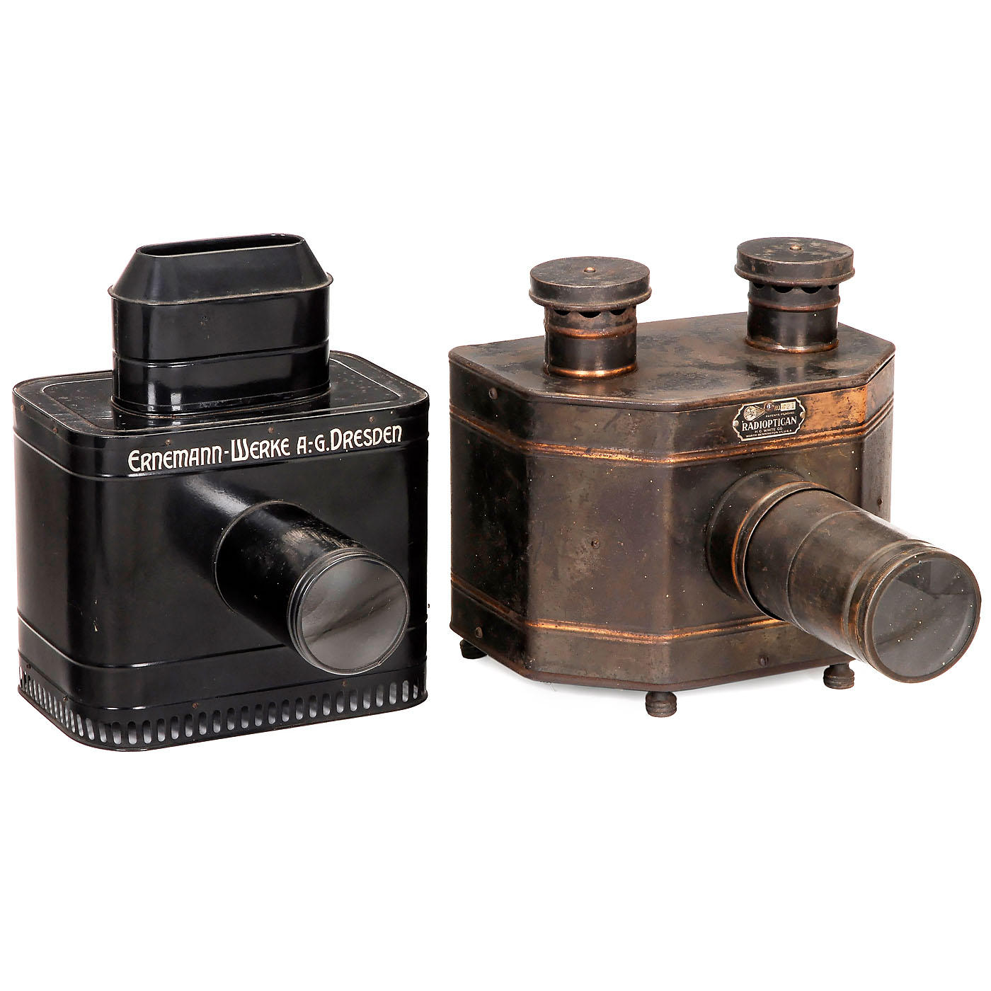 1) Ernemann, Dresden. "Megaskop", c. 1918, with square wooden frame for postcards of 9 x 13 cm, for electric illumination, height 13 in., without cable. – And: 2) H.C. White, USA. "Radioptican", c. 1920, serial no. 421, for postcards of 9 x 13 cm, electric illumination, height 11 3/4 in., with electric cable (fragile).