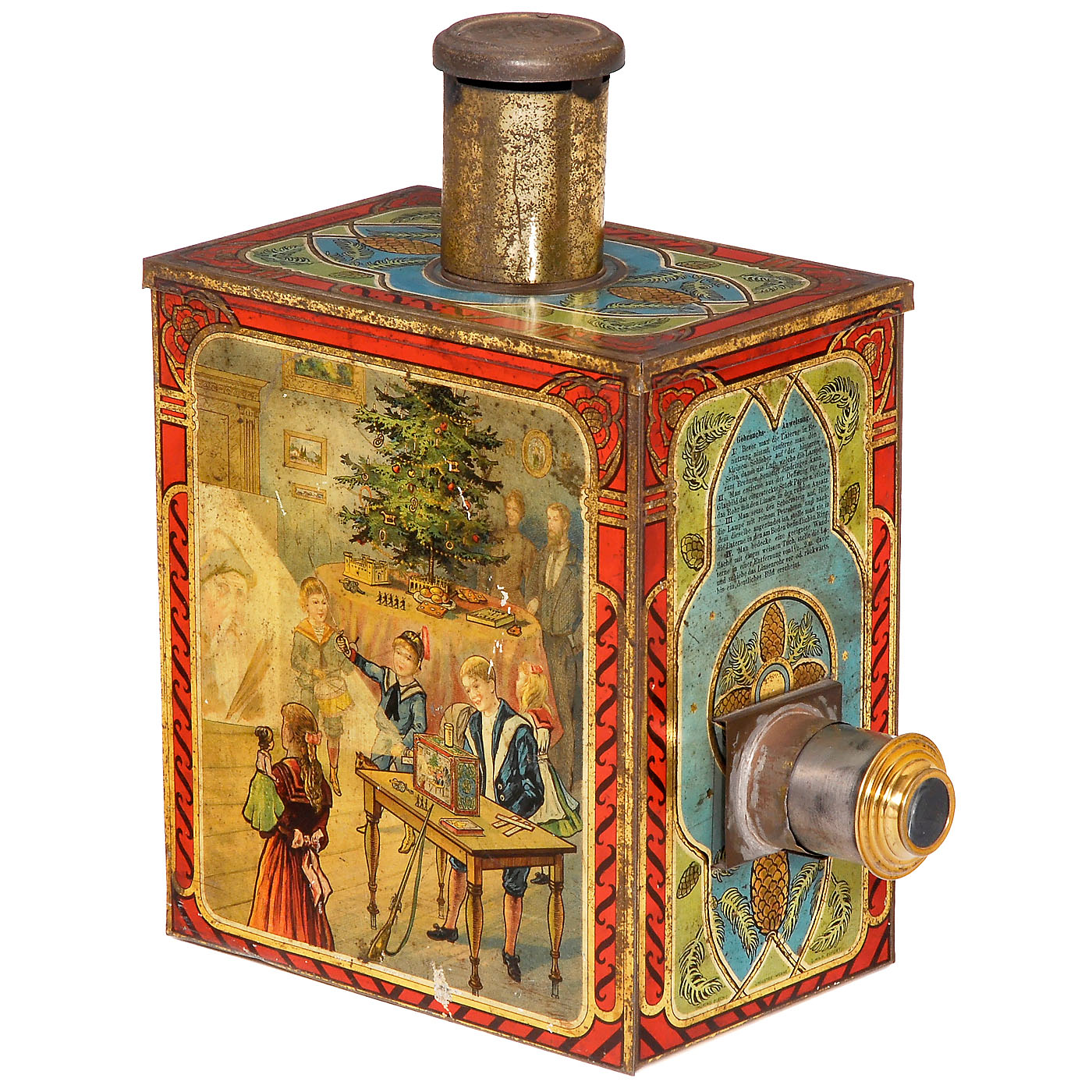 Thüringer Blech-Industrie-Werke, Erfurt. Chromolithographed tin body decorated on the sides with scenes of a family Christmas, tree, toys and a group of children projecting an image of Santa Claus using the same lantern, the front with lithographed instructions. For lantern slides with height of 2 in., height of the magic lantern 13 1/3 in. With original lens and original chimney. Back with small holes (presumably for electrification). – Very rare magic lantern, rarer than the "Buddha" or "Eiffel Tower"!