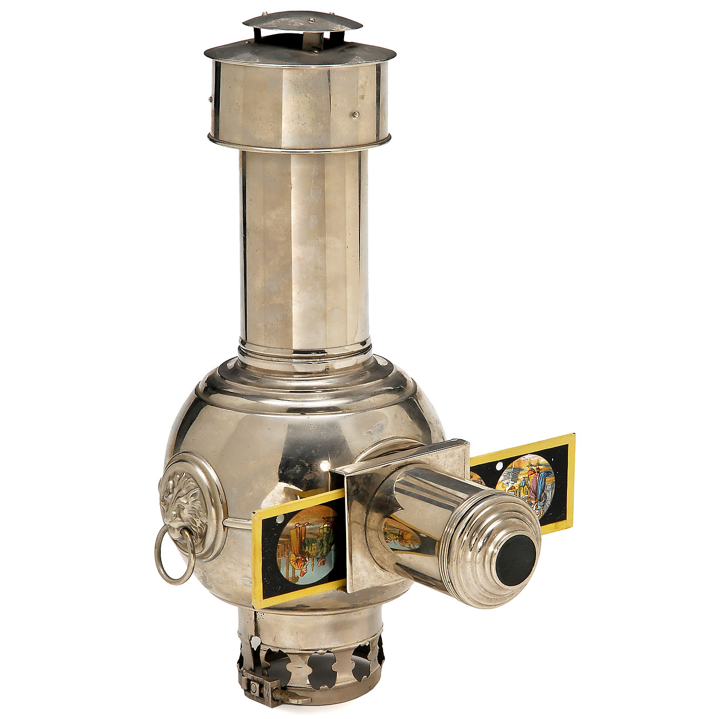 Frères Lapierre, Paris. Nickel-plated housing, for petroleum lamp, height 15 ½ in., for 2 ½ in. slides. Sides with lion's head handles.