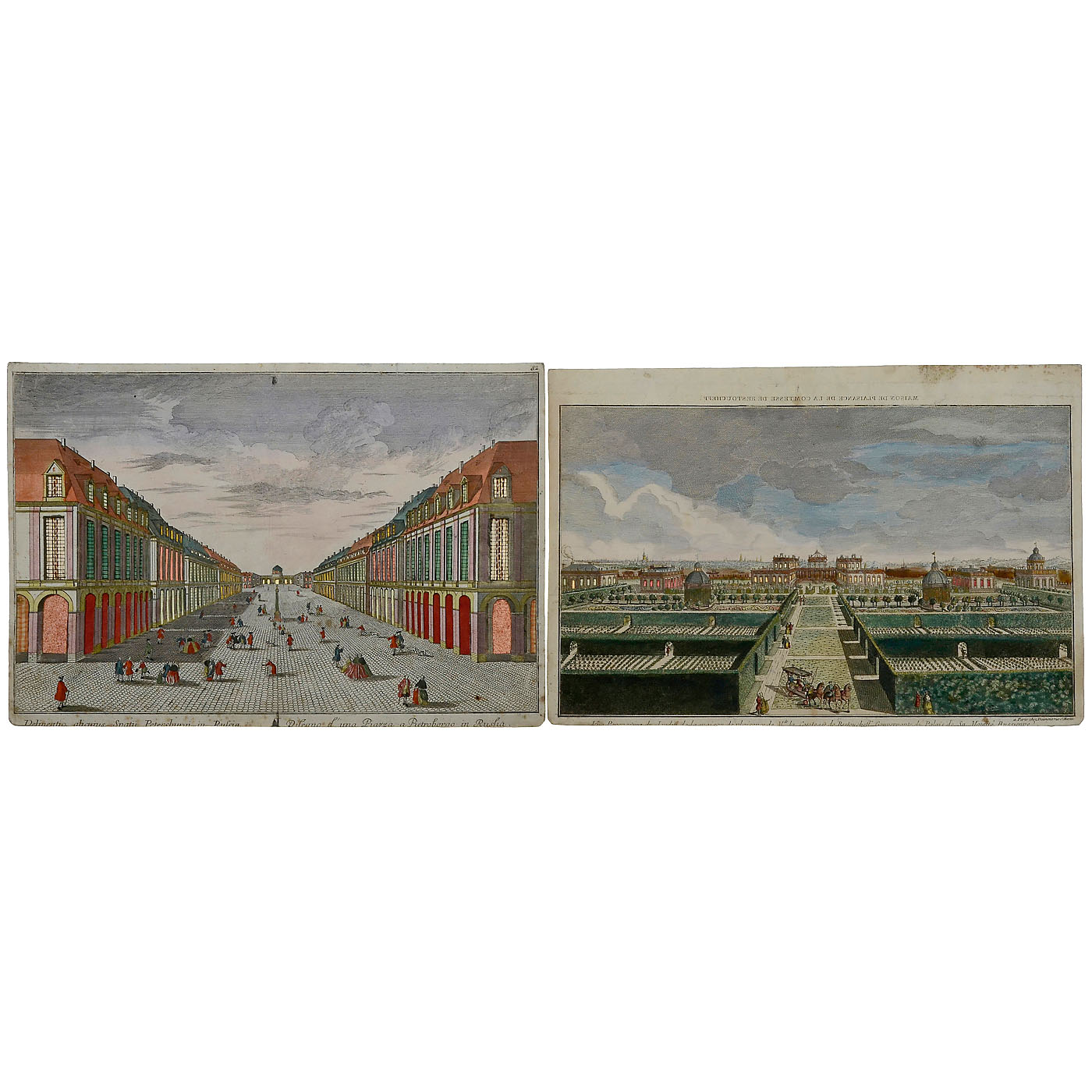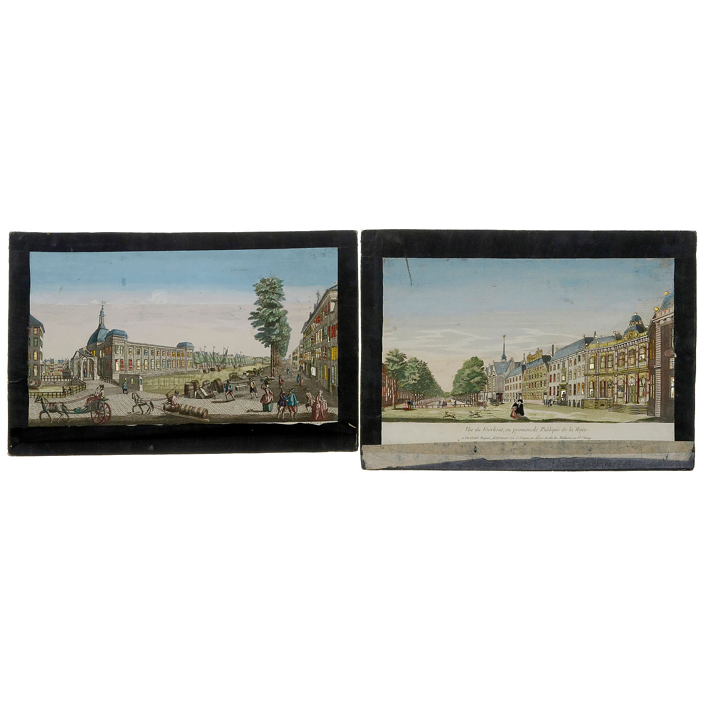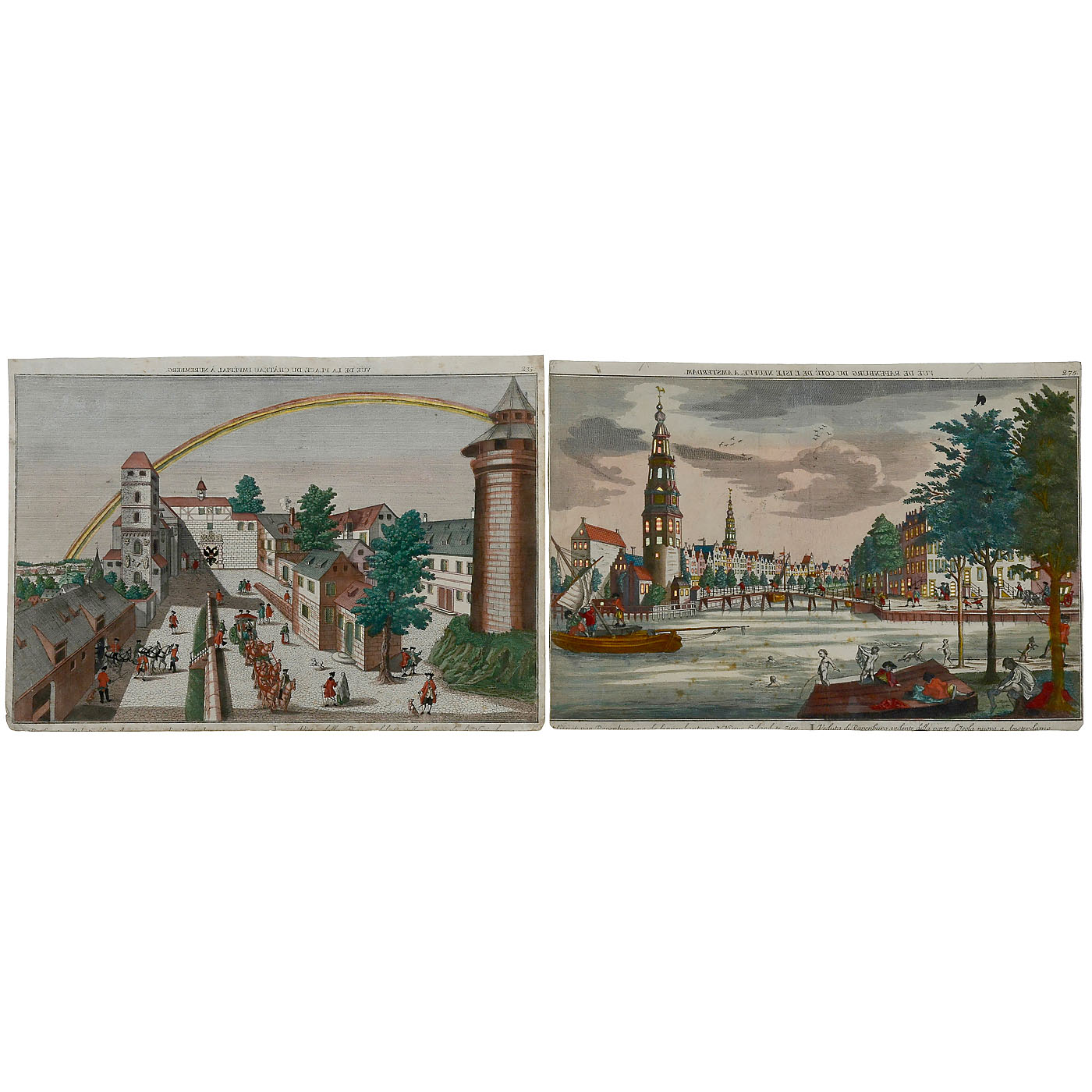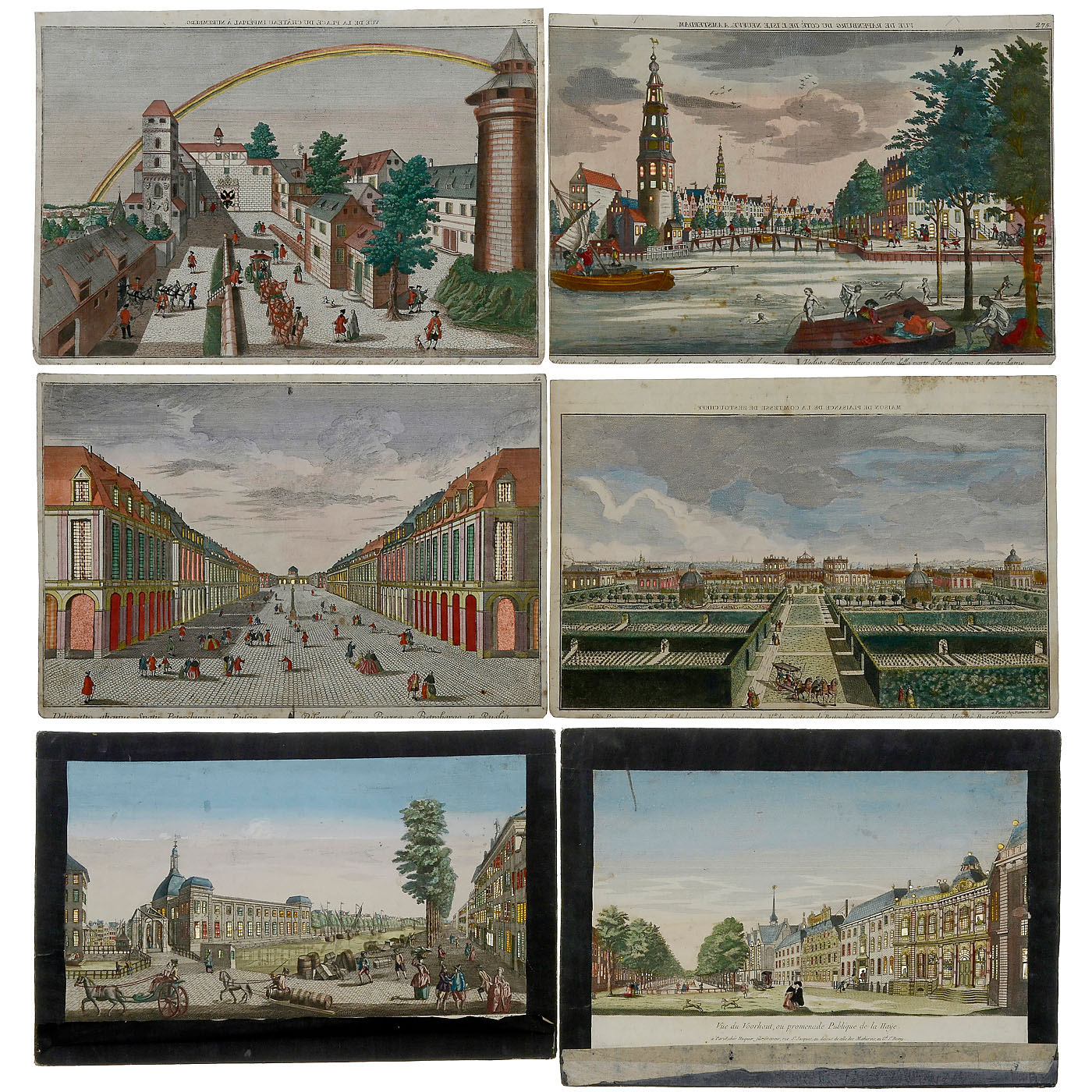 Original hand-colored copperplates, various artists and producers, size approx 16 ½ x 12 ¼ in., with pin-prick and cut-out light effects, some reverse-lined with colored tissue paper. Titles: 1) Delineatio alicuius Spatii Petersburg in Russia. – 2) Palais de sa Majesté Russienne. – 3) Vue du Voorhut, ou promenade Publique de la Haije. – 4) La Bourse de Roterdam. – 5) Veduta di Rapenburg, vedente sella parte l’Isola nuova a Amsterdamo. – And: 6) Illegible, down truncated.