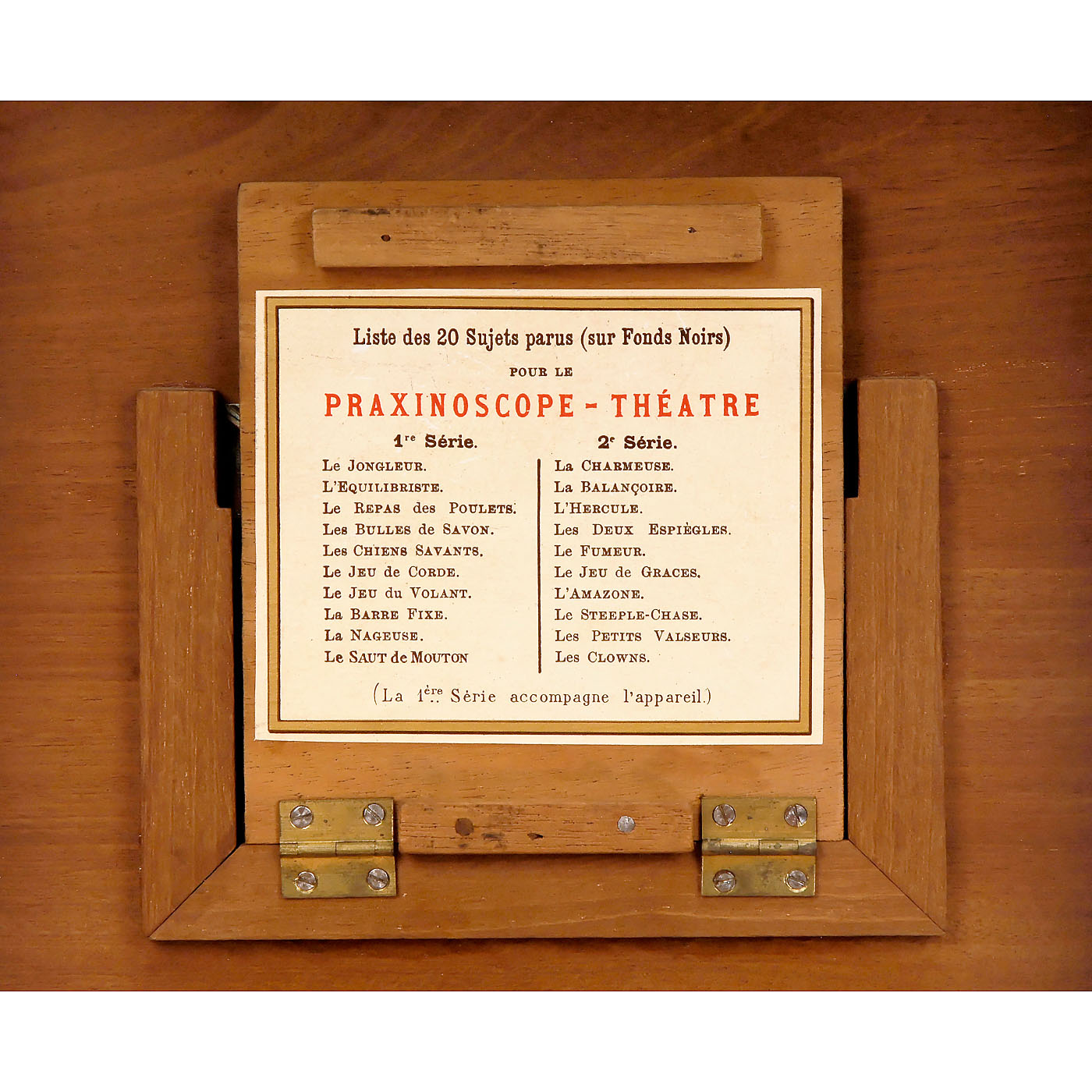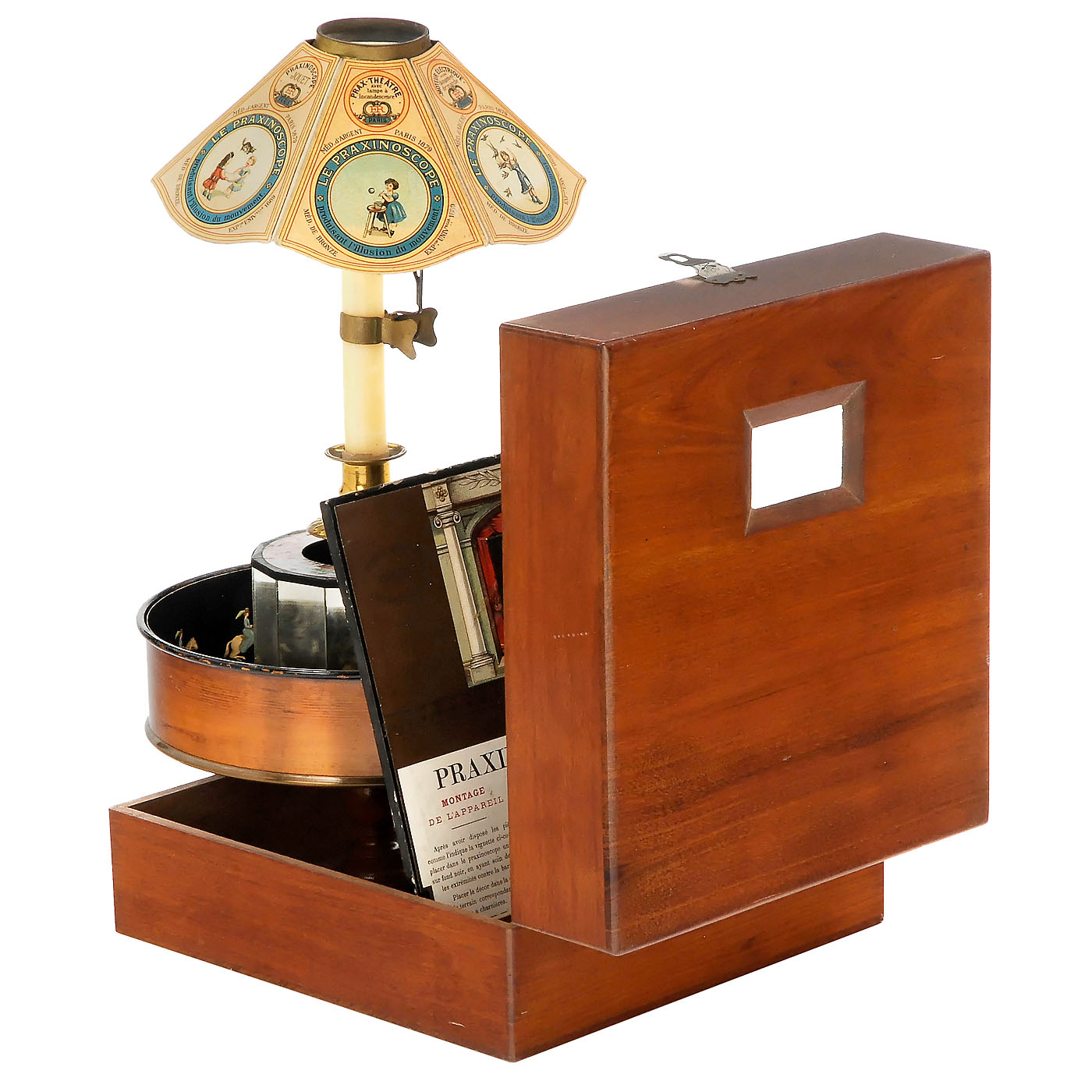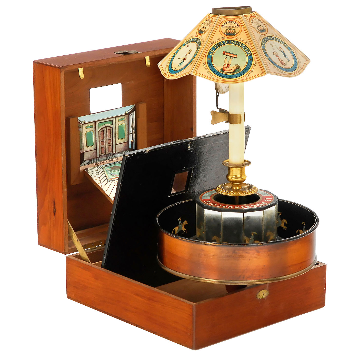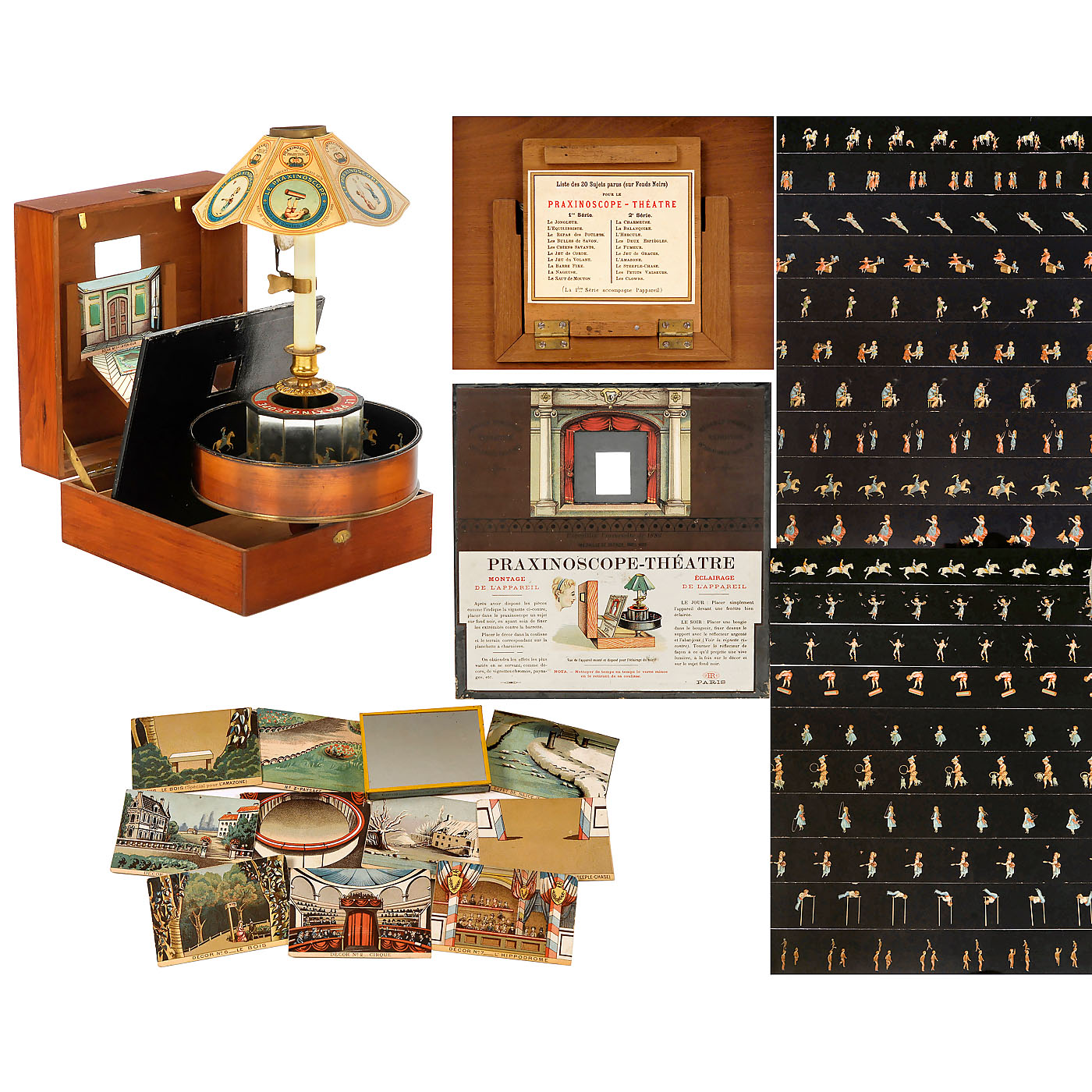 With 8 ½-inch (22 cm) diameter lacquered metal drum, mirrors, candle-holder, original shade and labels, in mahogany case with viewing window and card proscenium, wd. 9 ½ in. (25 cm). With all 20 strips and 10 stage sets among to other things: no. 1: interior, no. 2: circus, no. 3: landscape, no. 4: snow, no. 5: rare mirror for the "Nageuse"/female swimmer, no. 6: forest. Excellent original condition. – An improvement of the zoetrope, Émile Reynaud’s praxinoscope used a series mirrors with prism-like effect to create moving images without the typical 'flicker' associated with 'persistence of vision' devices. – Literature: Brian Coe, "The History of Movie Photography", p. 35. – An unusually complete and well-preserved example of an early pre-cinema toy.