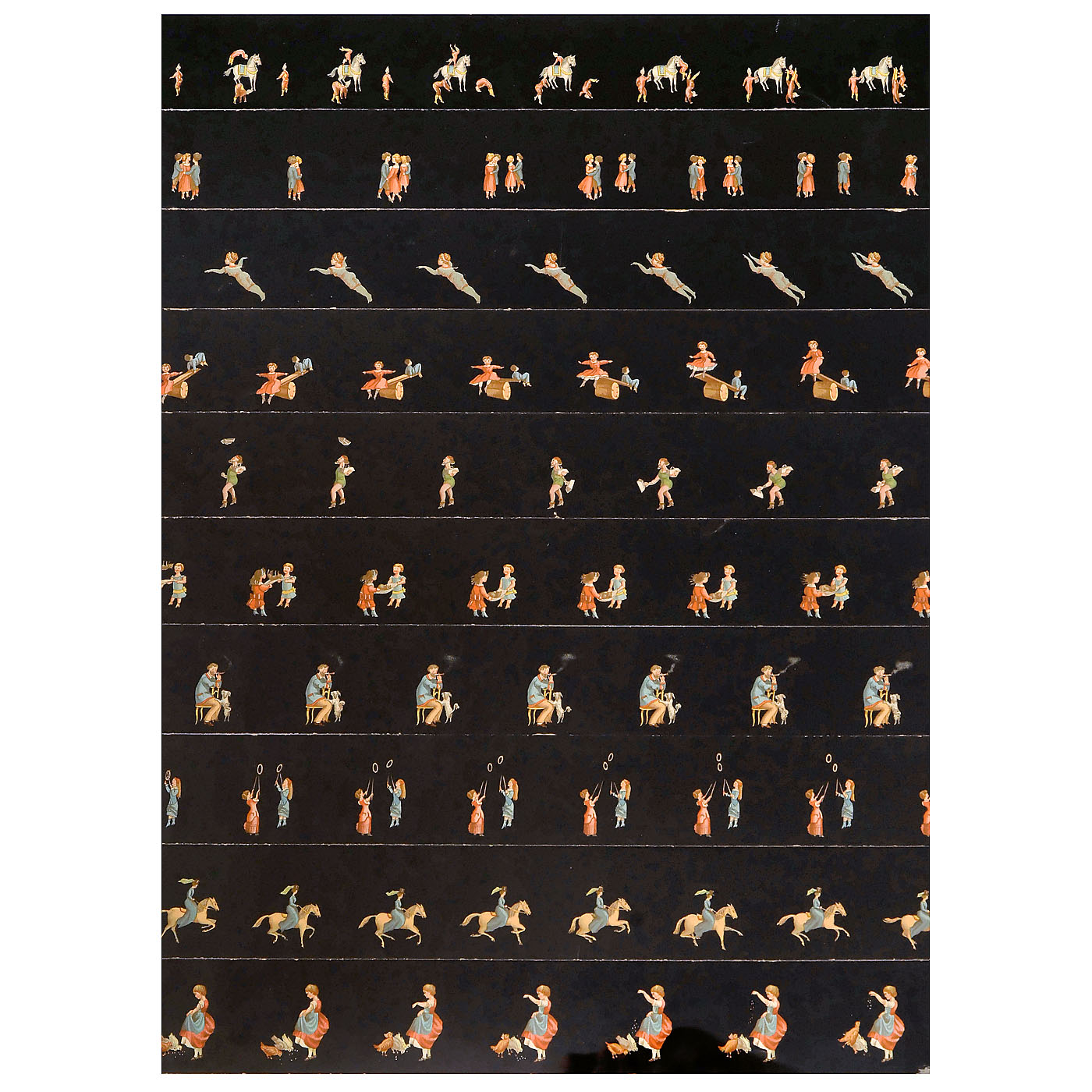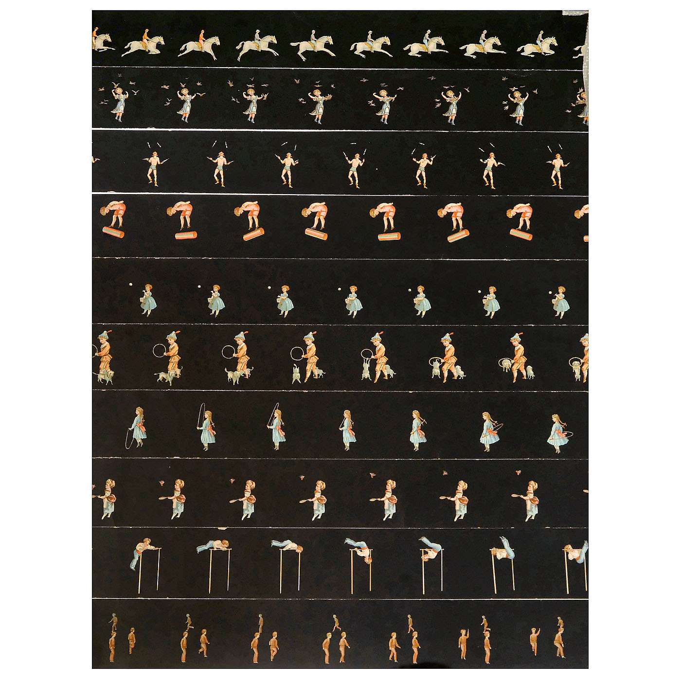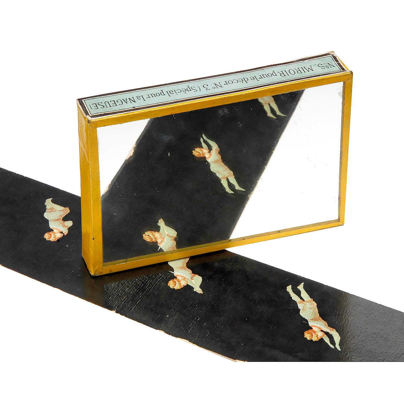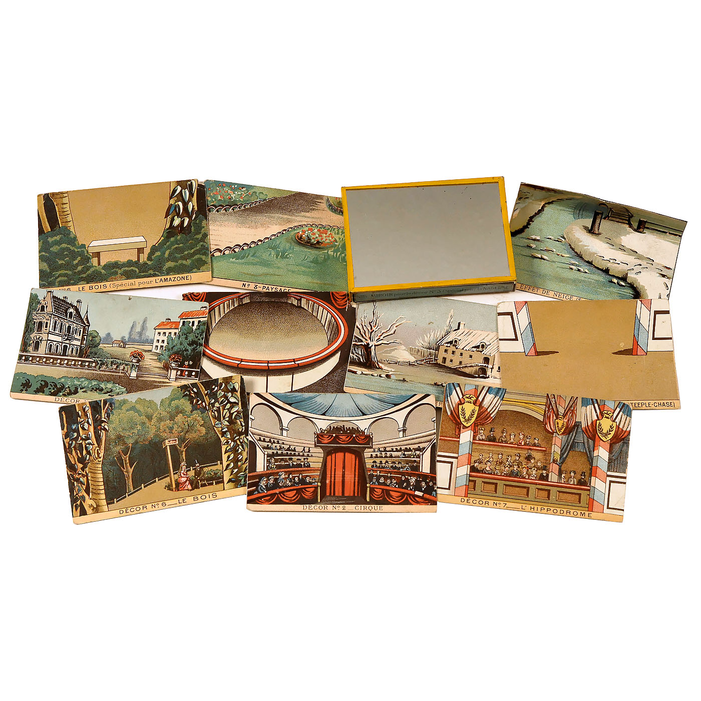 With 8 ½-inch (22 cm) diameter lacquered metal drum, mirrors, candle-holder, original shade and labels, in mahogany case with viewing window and card proscenium, wd. 9 ½ in. (25 cm). With all 20 strips and 10 stage sets among to other things: no. 1: interior, no. 2: circus, no. 3: landscape, no. 4: snow, no. 5: rare mirror for the "Nageuse"/female swimmer, no. 6: forest. Excellent original condition. – An improvement of the zoetrope, Émile Reynaud’s praxinoscope used a series mirrors with prism-like effect to create moving images without the typical 'flicker' associated with 'persistence of vision' devices. – Literature: Brian Coe, "The History of Movie Photography", p. 35. – An unusually complete and well-preserved example of an early pre-cinema toy.