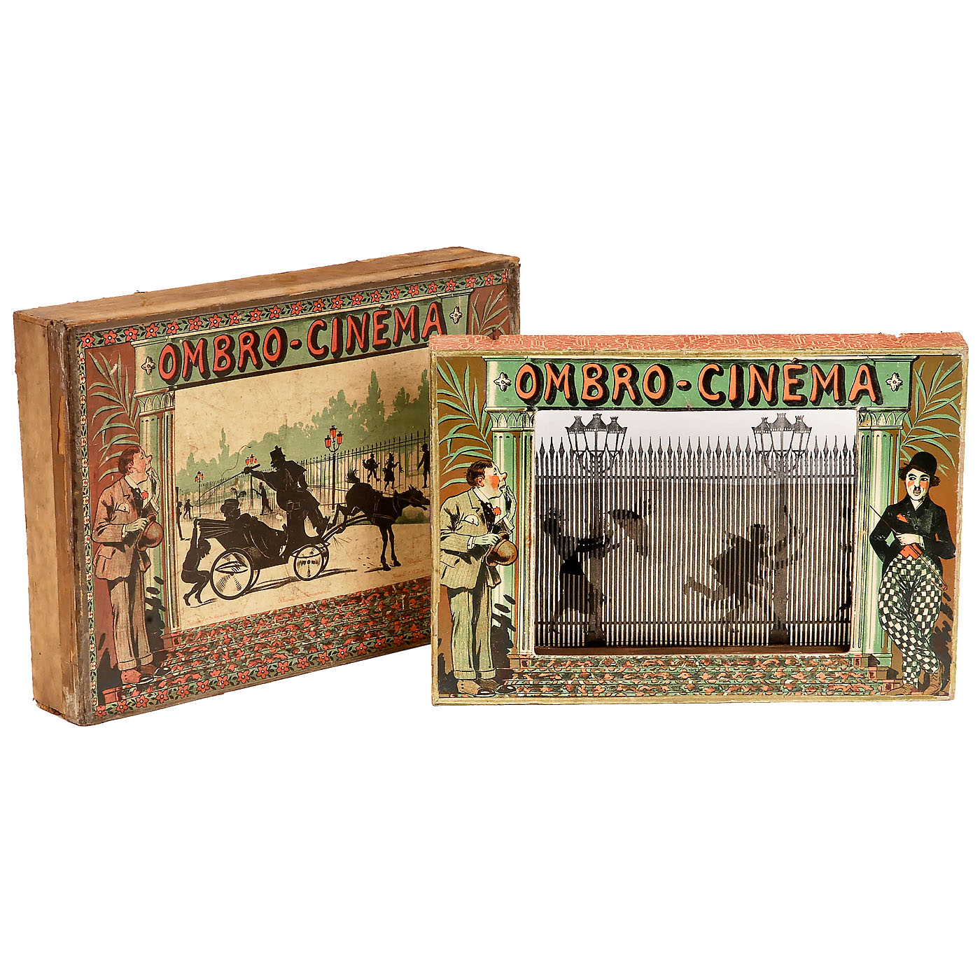 1) "Ombro-Cinema", Saussine Editeur Paris, c. 1915. Optical viewer for moving sequences, activated by a small musical movement (spring defective), with rewind spool and card box, size 3 1/3 x 17 ¾ x 13 in.– Literature: ACR 555. (3/–) – And: 2) Le Theatre "Ombres Chinoises". Anciennes maisons le Bailly et O. Bornemann, Paris, c. 1900. With approx. 50 shadow theater figures and booklet, in card box, 12 ½ x 10 in. (3/–)