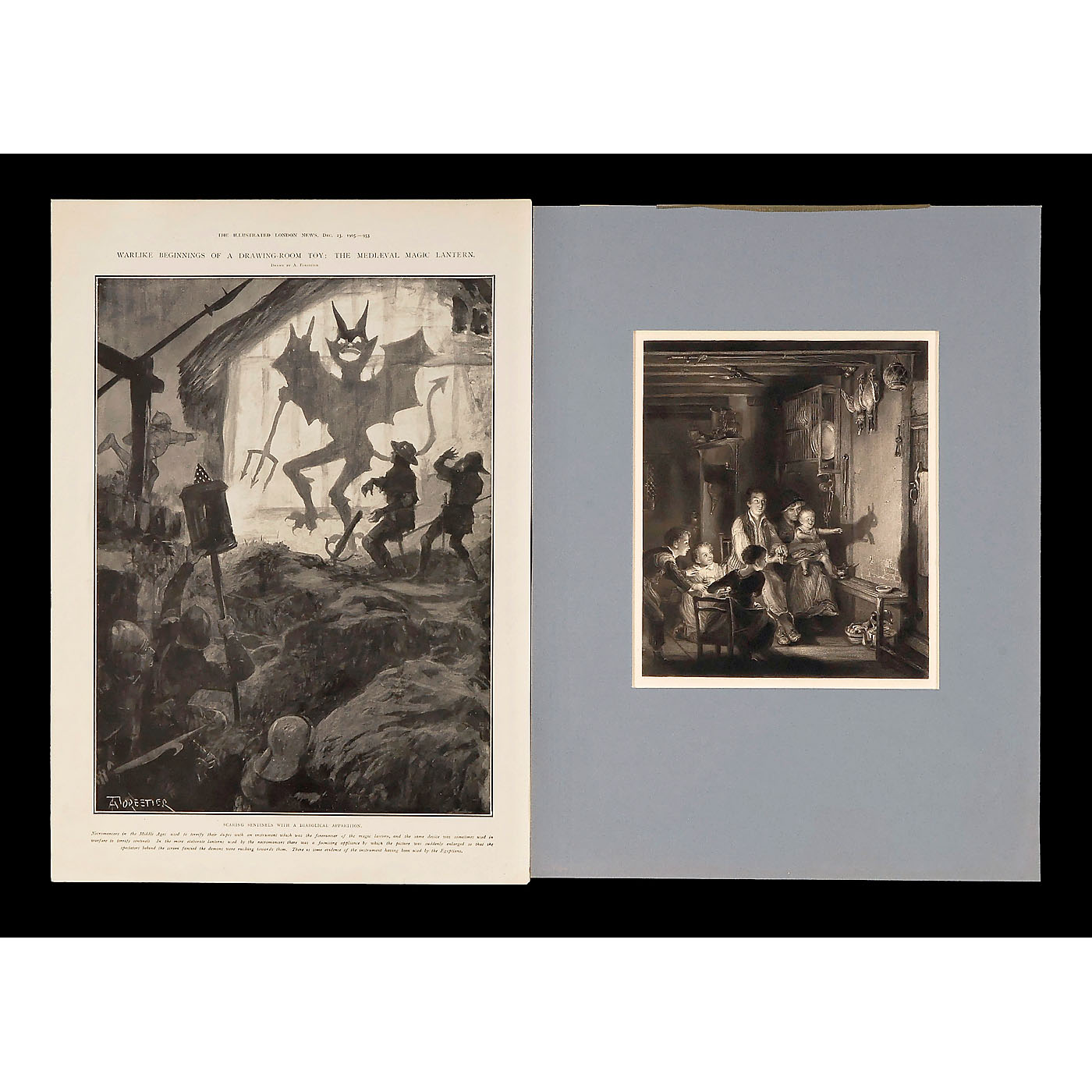 1) Copperplate engraving (Rabbit on the Wall), c. 1880, 7 4/5 x 6 ¾ in, with passe-partout. (2+/–) – And: 2) Print of a devil in the flames, England, 1905, 12 ½ x 9 ½ in. (2/–)