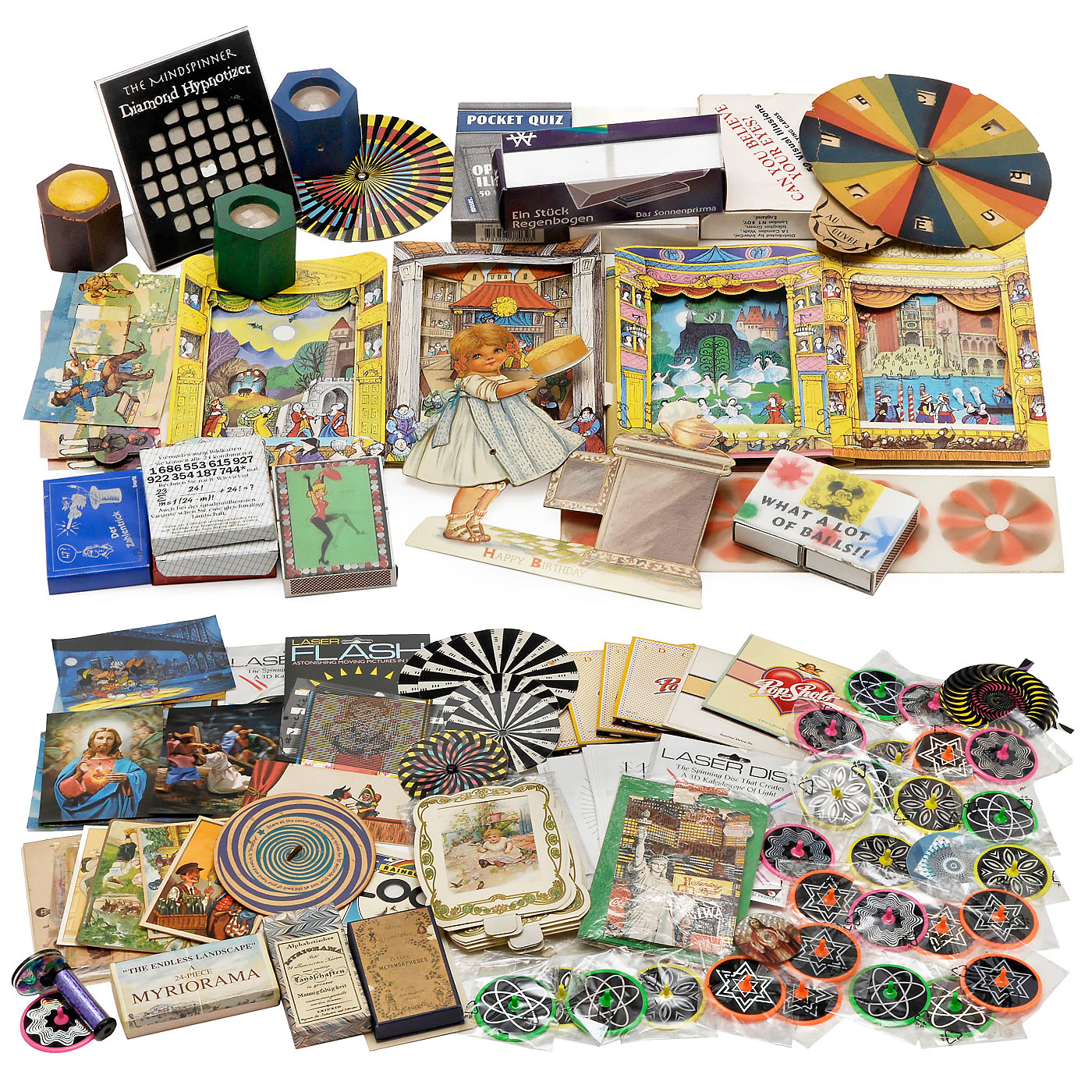 Over 100 "optical illusions" including: "Myriorama", "Petits Metamorphoses", pack of cards, pull-push postcards, spinning tops, 3-D cards and many more. – Worth a look!