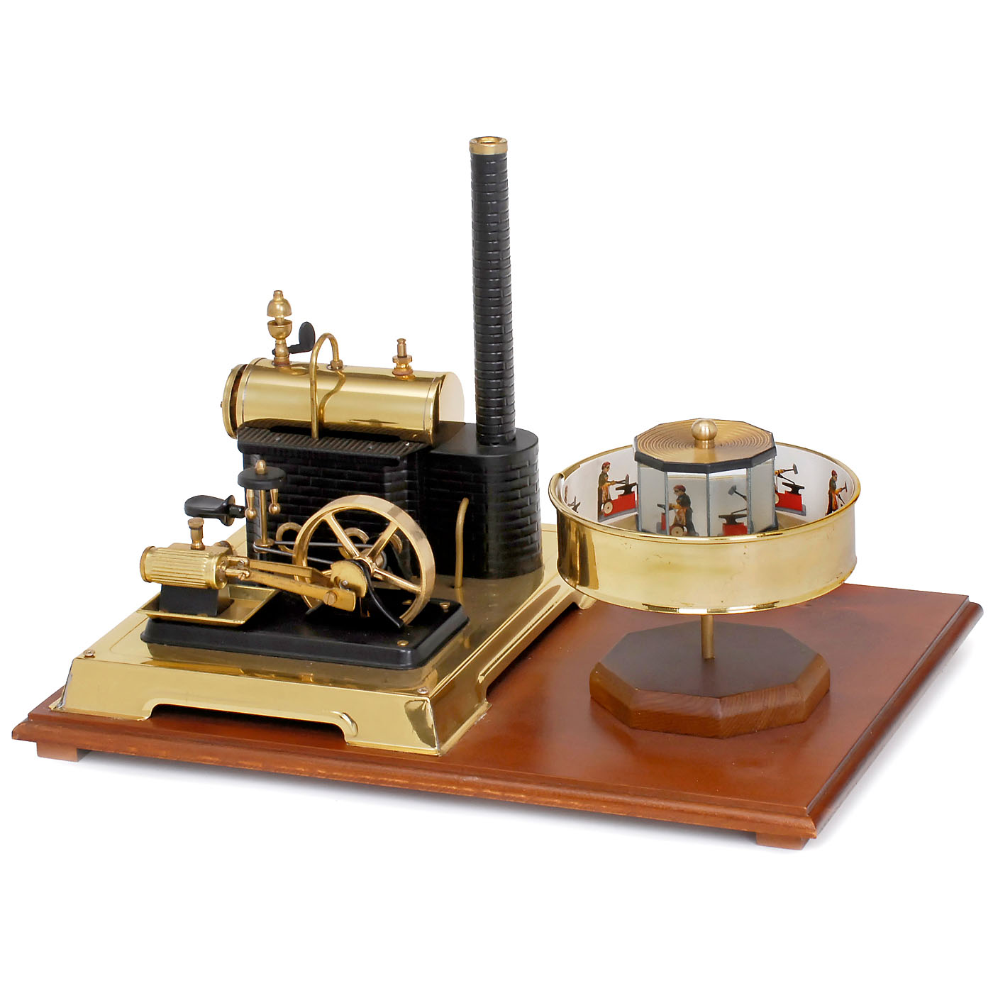 Wilesco, Lüdenscheid, Germany. Steam engine D106 and praxinoscope, mounted on wood board. – Like new!