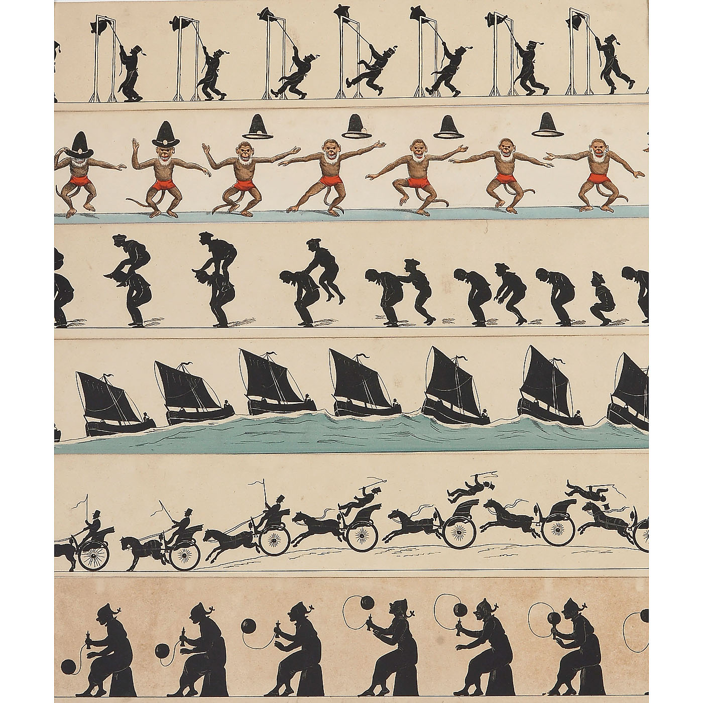 Wheel-of-life. Card drum with wood base, drum Ø 8 ¾ in., height 11 ¾ in. With original drum cover, labeled: "Les Images Vivantes – Petits Tableaux Animés". – In addition: 12 double-sided paper strips (approx. 30 x 3 1/6 in.).