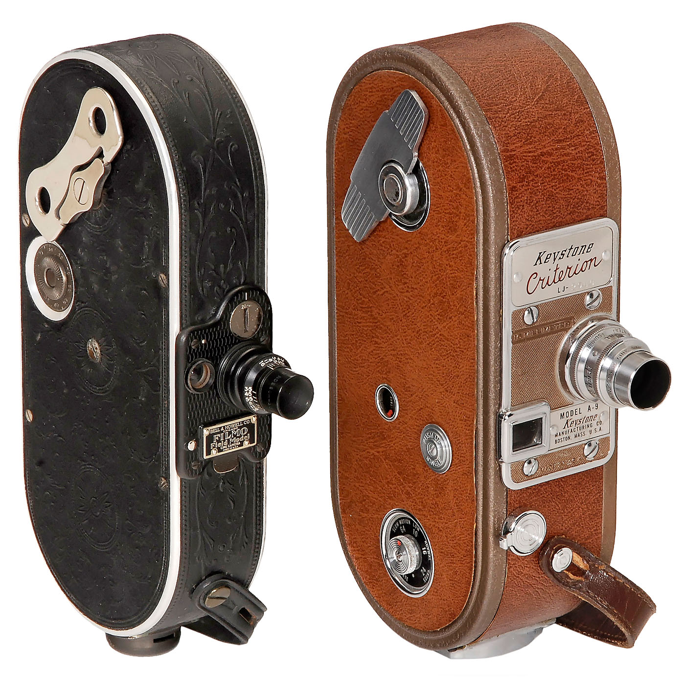 1) Keystone, USA. Keystone Criterion Model 9A, c. 1955. 16mm movie camera for 30m daylight cassettes, clockwork drive, 10–64 p/s, changeable Wollensak 1:2,5 1 in. (C-mount) lens, Newton viewfinder. – And: 2) Bell & Howell, USA. "Filmo Field Model", c. 1928. 16mm movie camera for 30m daylight cassettes, clockwork drive, 16 p/s, lens by Taylor & Hobson 3,5/20 mm, Newton viewfinder.
