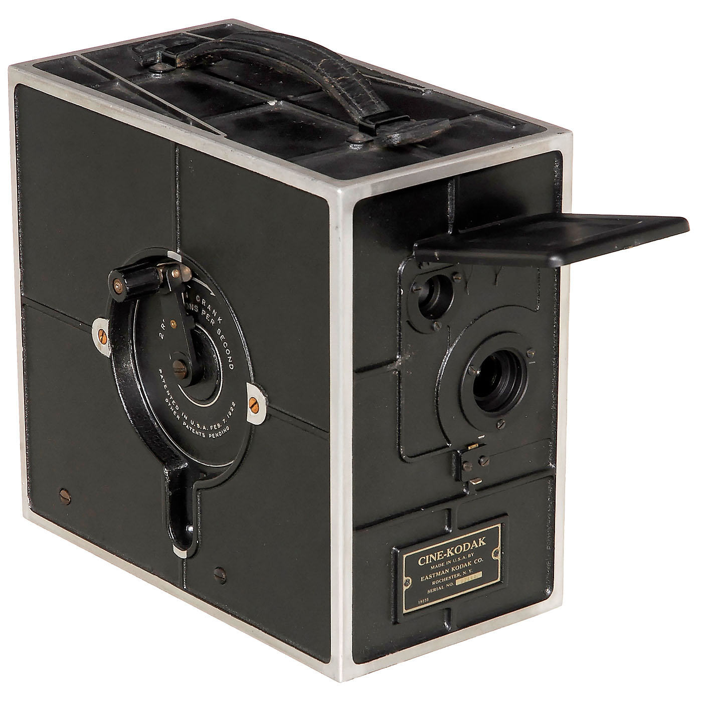 Kodak, USA. 16mm movie camera for 30m daylight cassettes, crank-drive, Kodak Anastigmat 3,5/25 mm, focusing and diaphragm adjustments on back, viewfinder for inverted image on back, large footage counter. – A milestone in amateur cine cameras!