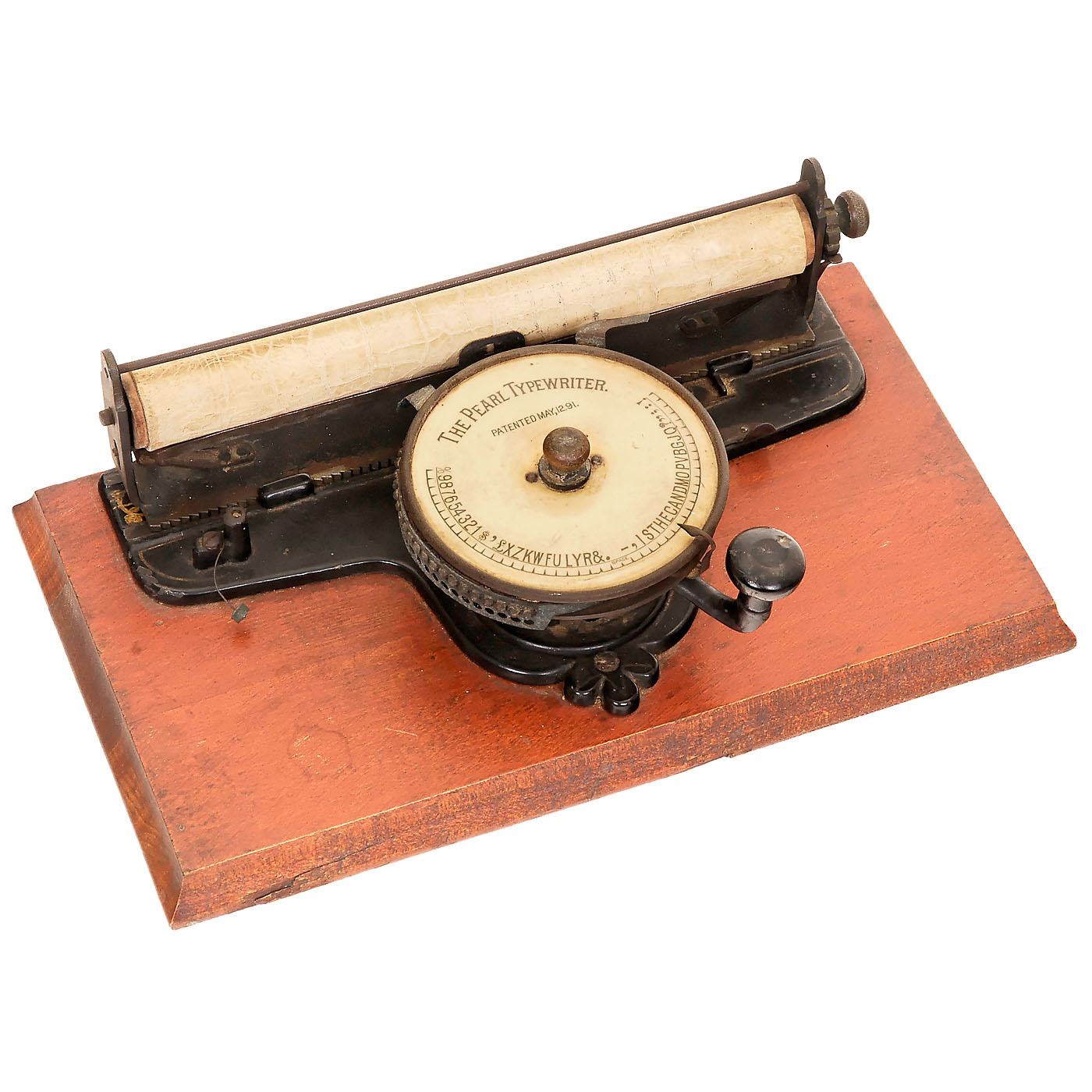 American index typewriter, variation 2 with painted metal frame base, invented by Theodore W. Searing, patented May 12, 1891, patent no. 452280, manufactured by Pearl Typewriter Company of New York. Circular index with 48 characters, celluloid disc with printed patent date, wood base 11 ¾ x 6 ½ in., no bell or ink rolls, unrestored original condition. - Extremely rare!