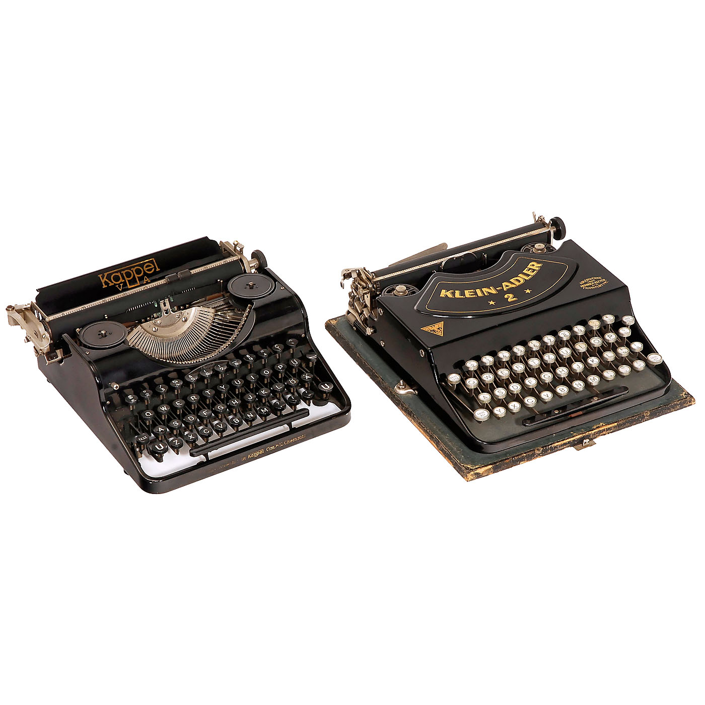 1) Kappel VA, no. 105289, Maschinenfabrik Kappel in Chemnitz, Germany. - 2) Imperial: "The Good Companion", Imperial Typewriter Company, Leicester, England. - 3) Klein-Adler 2, no. 362802, Adlerwerke, Frankfurt. - And: 4) Diplomat 3, Europa Schreibmaschinen AG, Erfurt, Germany.