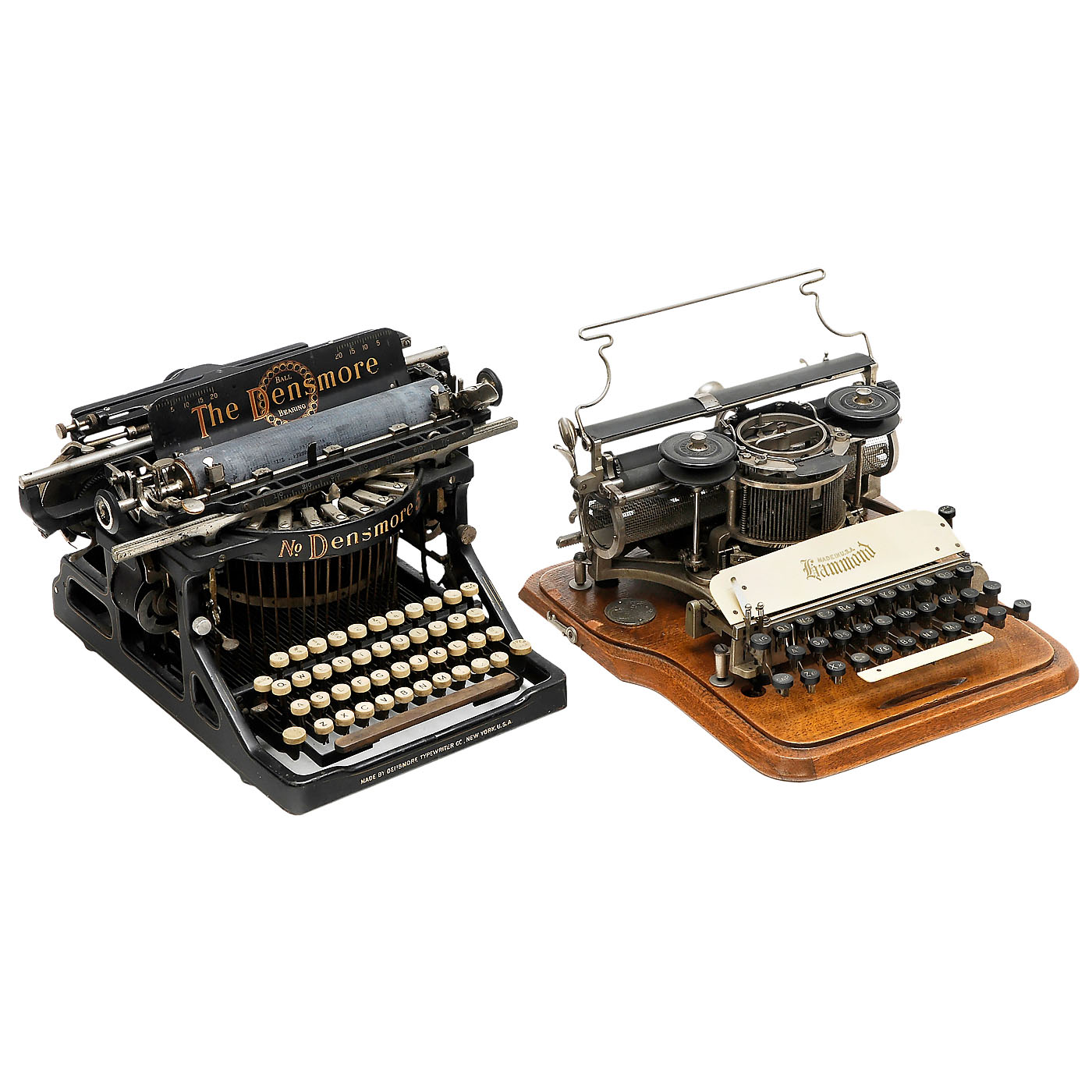 1) Densmore No. 5, 1904, American upstroke machine with ball-bearing typebar mechanism and carriage. In good condition. Serial no. 27966. (2/2) - Literature: Martin, 1949, p. 125. - And: 2) Hammond No. 12, 1904, with straight universal keyboard, serial no. 83036. (2/2) - Literature: Martin, 1949, p. 79.