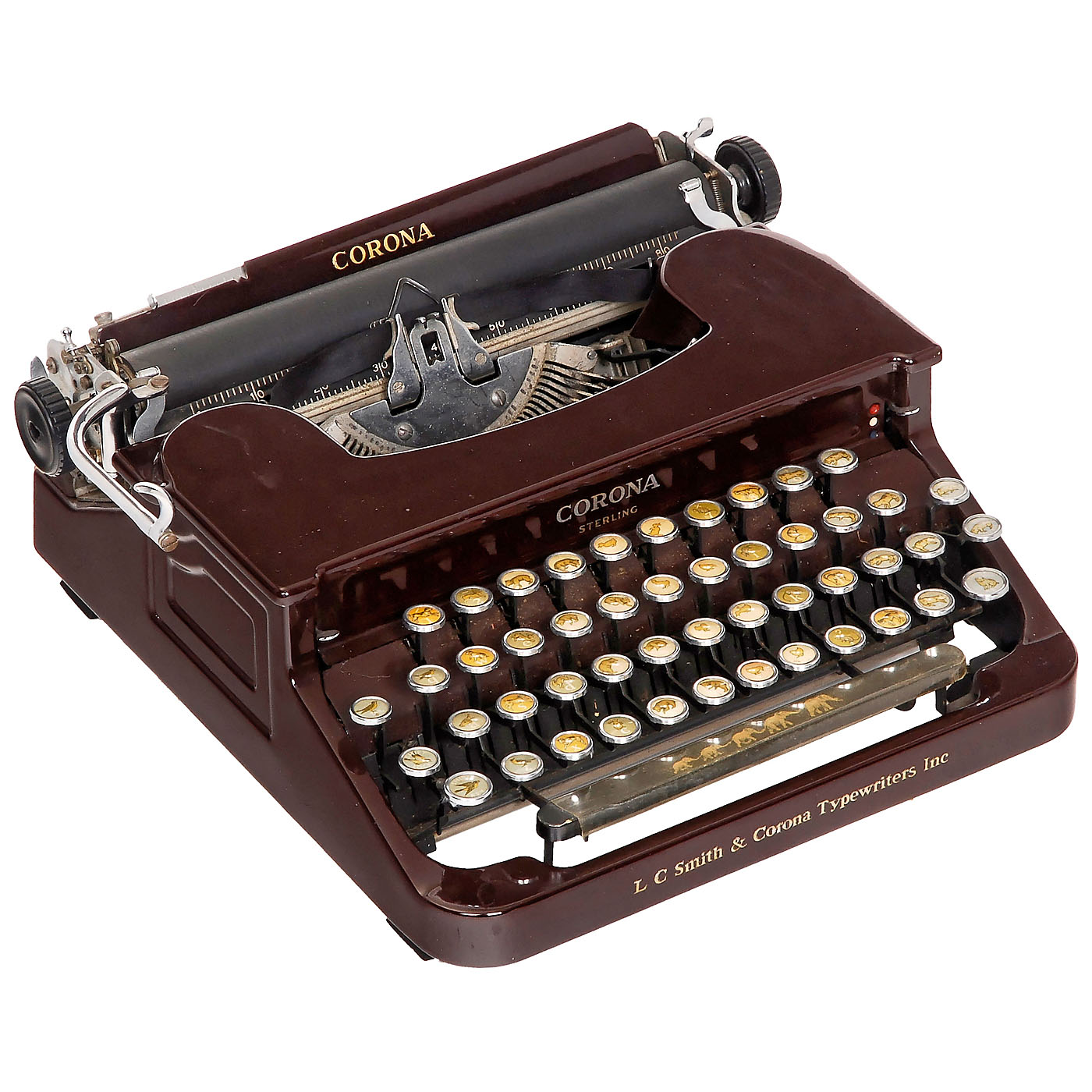 Made by L.C. Smith & Corona Typewriter Inc., Syracuse, New York. Marketed by the Corona Company with the slogan "A gift to help little fingers guide eager young minds". The company equipped normal portable typewriters, in this case the model "Sterling", f