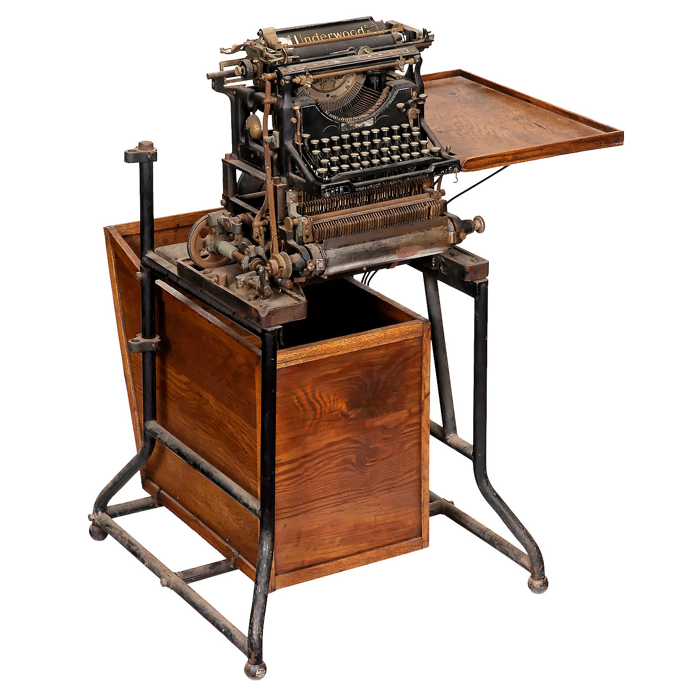 Made by The Hooven Automatic Typewriter Co., Hamilton, Ohio, USA. World's first automatic typewriter operated by punched paper tapes on ordinary (manual) machines. Complete set consisting of perforator, printer, Underwood no. 5 typewriter, metal stand and electric motor drive (110 V). Partly rusty, otherwise in complete and unrestored condition.
