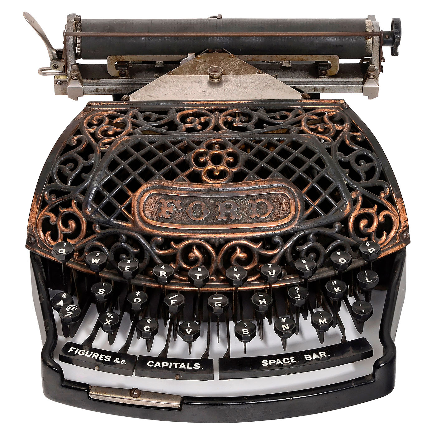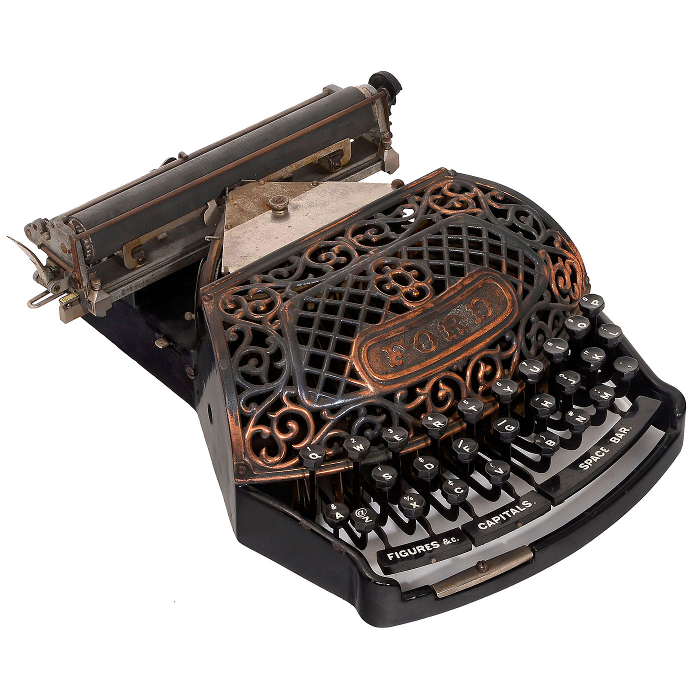 Ford Typewriter Company, New York, USA. American thrust-action three-bank double-shift ribbon typewriter with beautifully decorated copper-plated typebar cover. Low serial no. 098! - Literature: P. Lippman, "American Typewriters", 1991, p. 83. - A superb collector's item and exhibition piece!