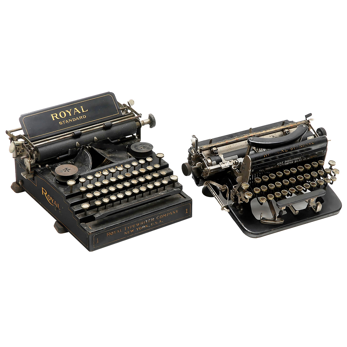 1) Imperial Mod. D, 1925, attractively designed British typewriter, with shift on both sides, serial no. D-53454. (3/3) - And: 2) Royal Standard No. 1, c. 1908, Royal Typewriter Company, New York, frontstroke, serial no. 69197. (4/4)