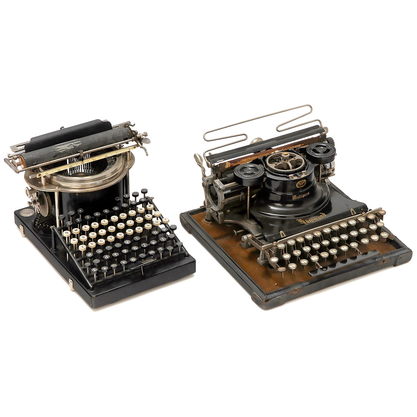 1) Yost No. 1, first version from 1887, made by Yost Writing Machine Company, Bridgeport, USA. Circular ink pad, grasshopper mechanism, 2 nickel-plated medallions at the rear, missing 1 key and 2 keytops, serial no. 1888, a rare and sought-after historical typewriter. - Literature: Martin, 1949, p. 98. - And: 2) Hammond Multiplex, 1913. Portable type-shuttle and hammer-typing mechanism machine with straight universal keyboard and case, missing one keytop. Serial no. AL 222431. - Literature: Martin, 1949, p. 82.