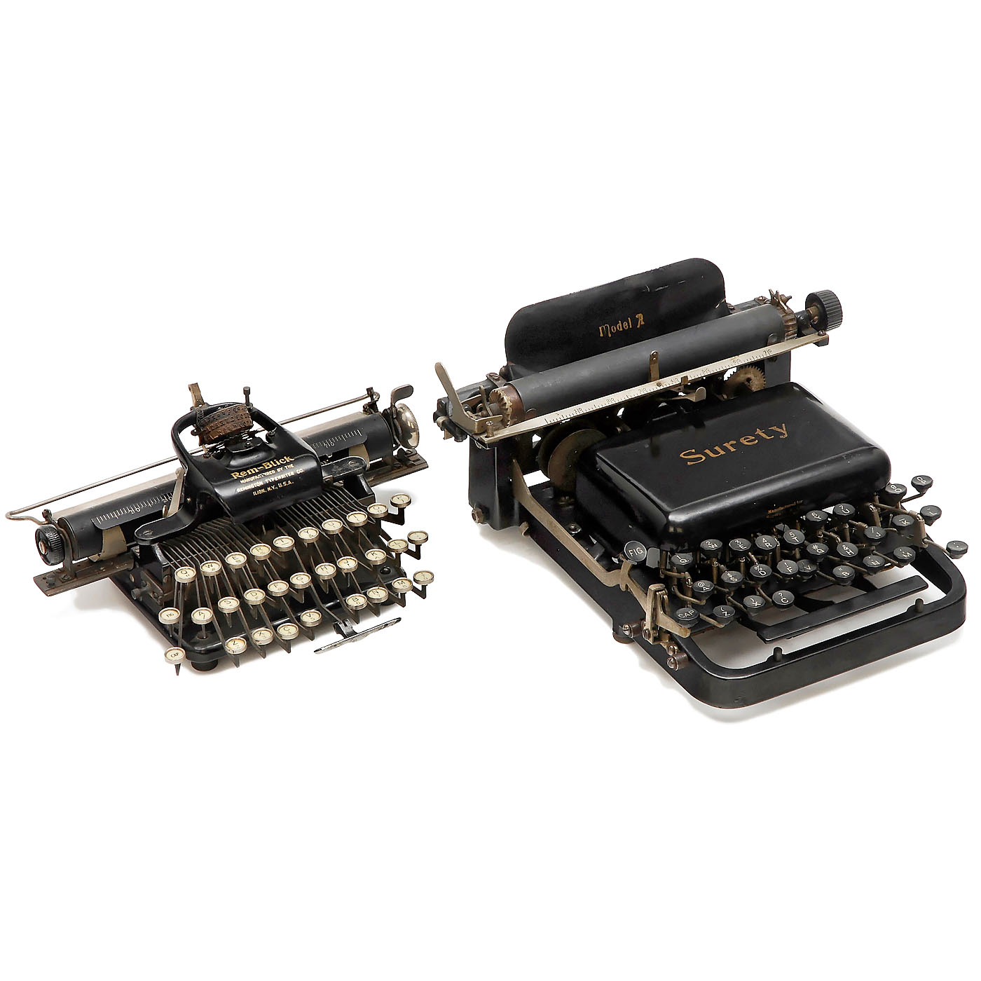 1) Surety Mod. A, 1903, serial no. 28518, rare model name for the "American" upstroke typewriter (or in England: "Armstrong Mod. 8"). Manufactured for Stewart & Co., Baltimore, MD, USA, mechanism partially rusty. (3/5) - And: 2) Rem-Blick, 1928, the relaunch of the "Blick No. 5" after 35 years, when the Remington Rand Company, Ilion, NY, took over the Blickensderfer Co., serial no. KD80583. (3/3)