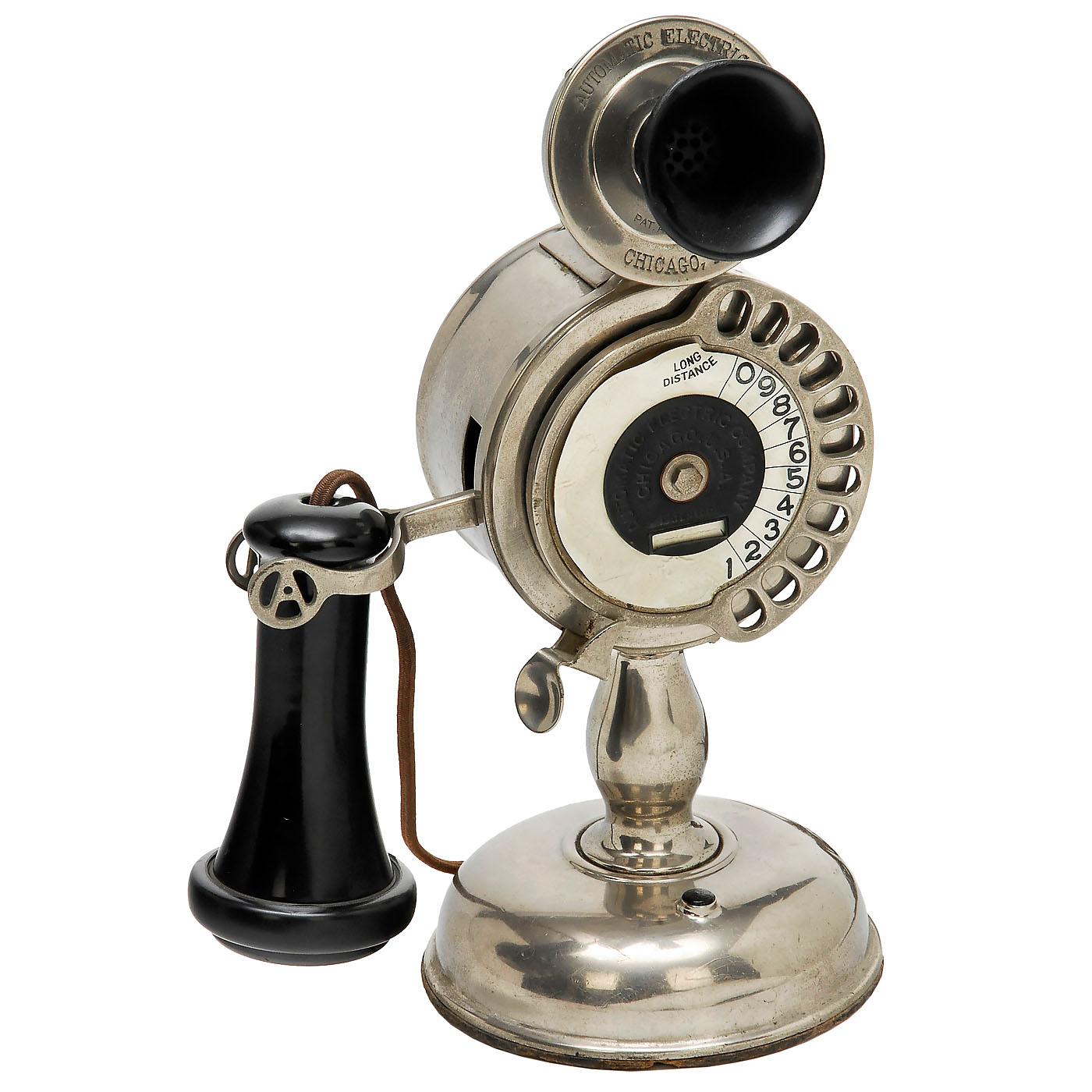Automatic Electric Company, Chicago. Strowger unique dialing mechanism with 11 finger holes, nickel-plated case, Bell-type bakelite earphone. The first dial telephone in the world.