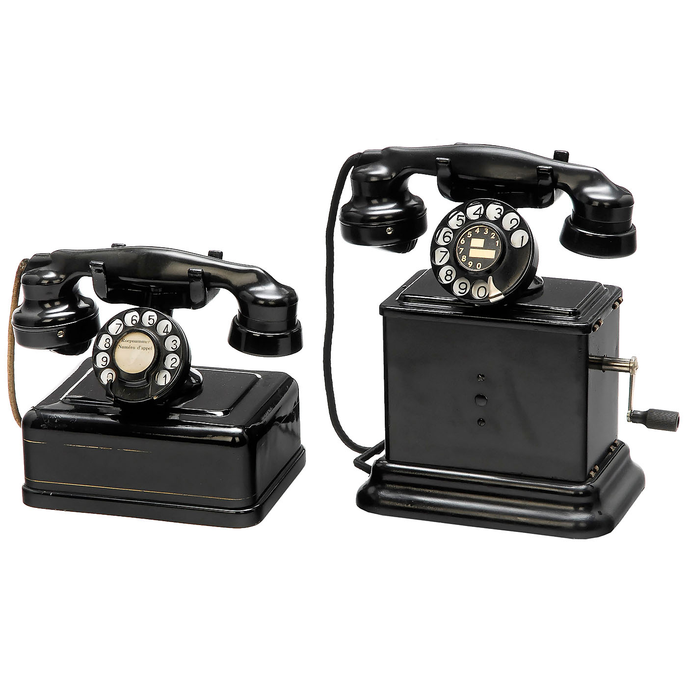 Bell Telephone Mfg. Co., Anvers. Metal cases, bakelite handsets. 1) With crank and dial, c. 1930. - And: 2) With dial, c. 1940.