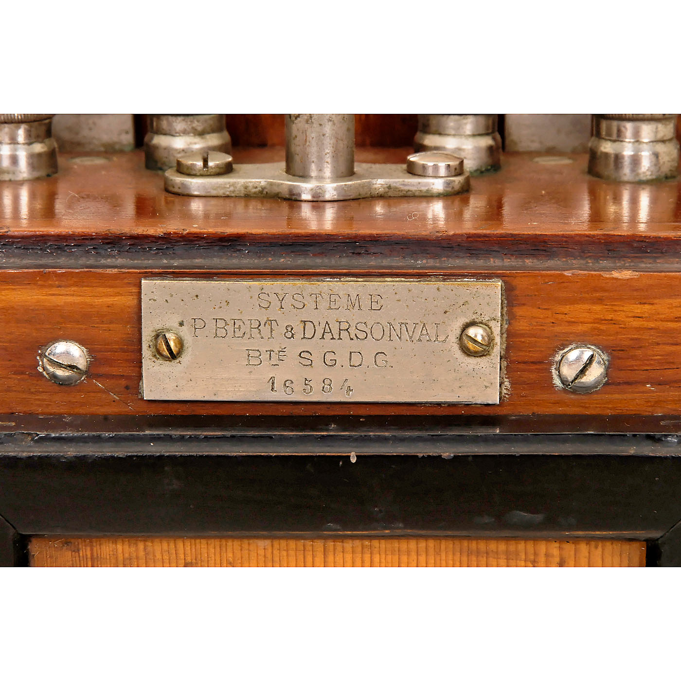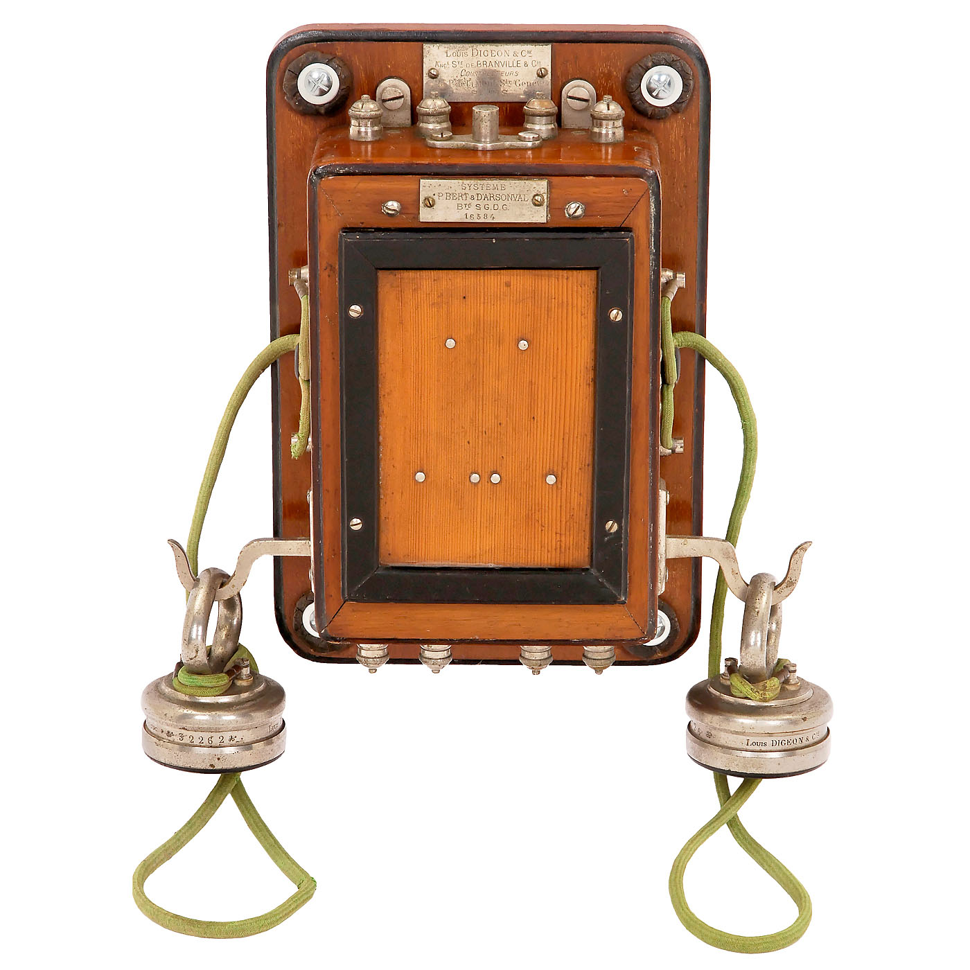 Louis Digeon & Cie, Paris. Système P. Bert & d'Arsonval, no. 16584, carbon barrel microphone with pine wood membrane, 2 earphones, marked "Système Aubry, Louis Digeon & Cie". - A very rare telephone, in good condition!