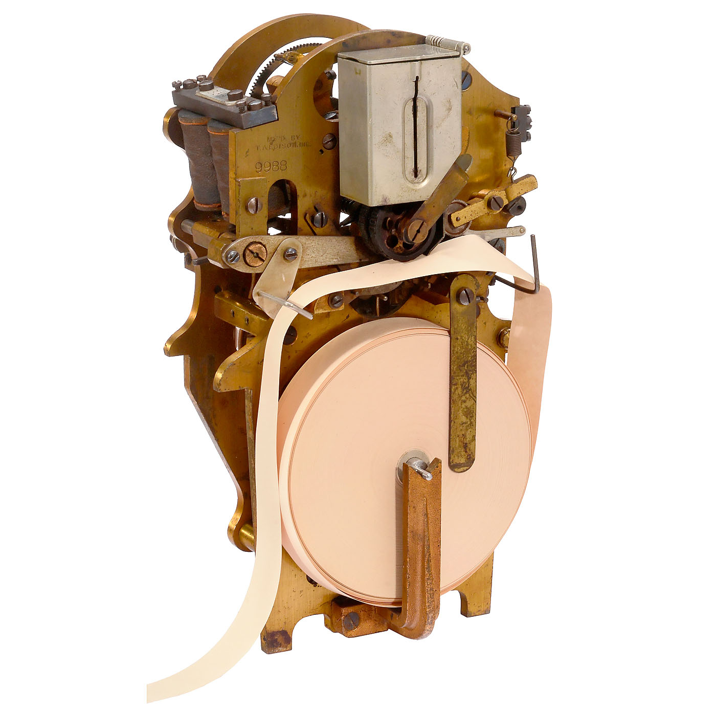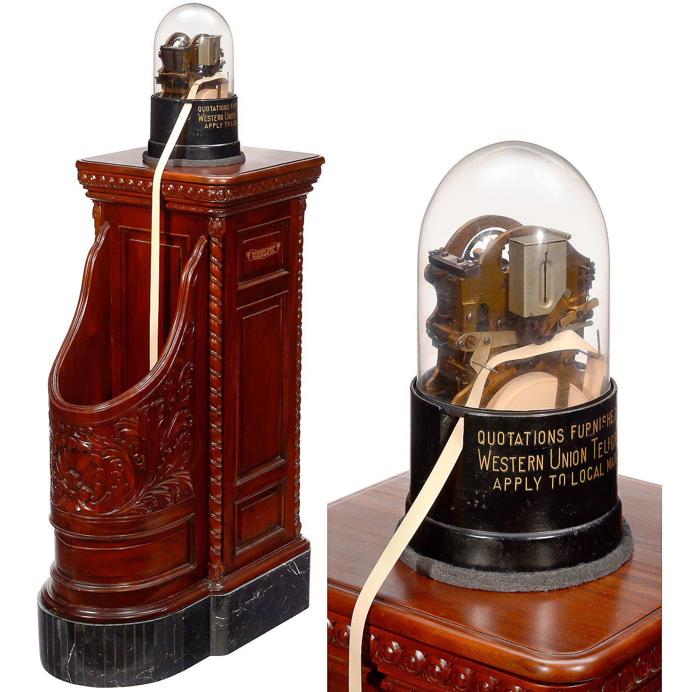 Marked: "M'f'd. by T.A. Edison, Inc.", serial no. 9988, original lacquered brass, 14 4/5 in., complete with cast-iron base and glass dome, base labeled: "Quotation furnished by the Western Union Telegraph Co. - Apply to local manager". This is a handsome example of the famous stock ticker which was used to communicate stock ratings at banks and offices, and which figured in so many iconic films of the 1930s and 40s. On wood base with moldings and columns, panels and front receptacle for the expelled ticker tape (stand later). Including a photograph copy of a machine in use. - An extraordinary collector's item and display piece!