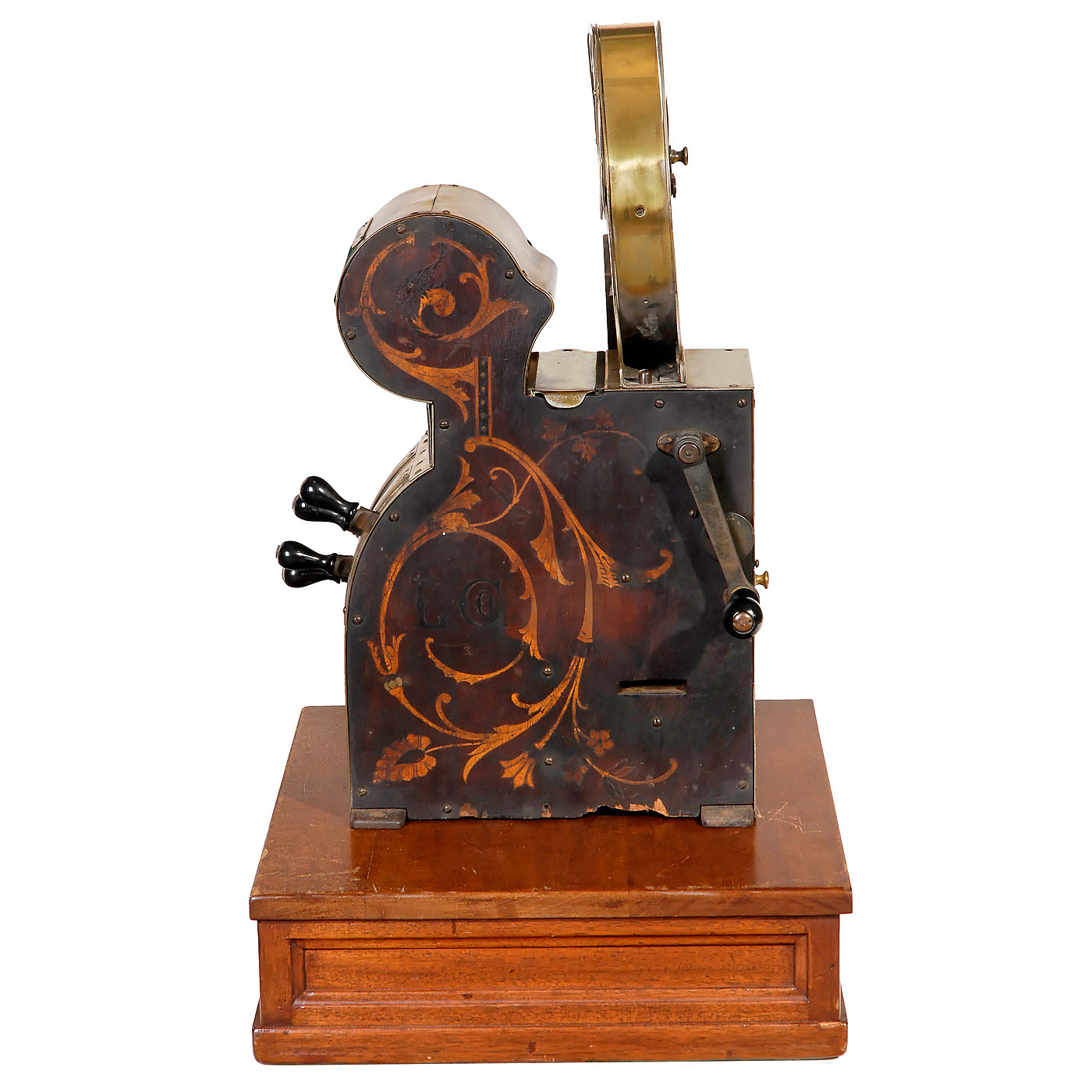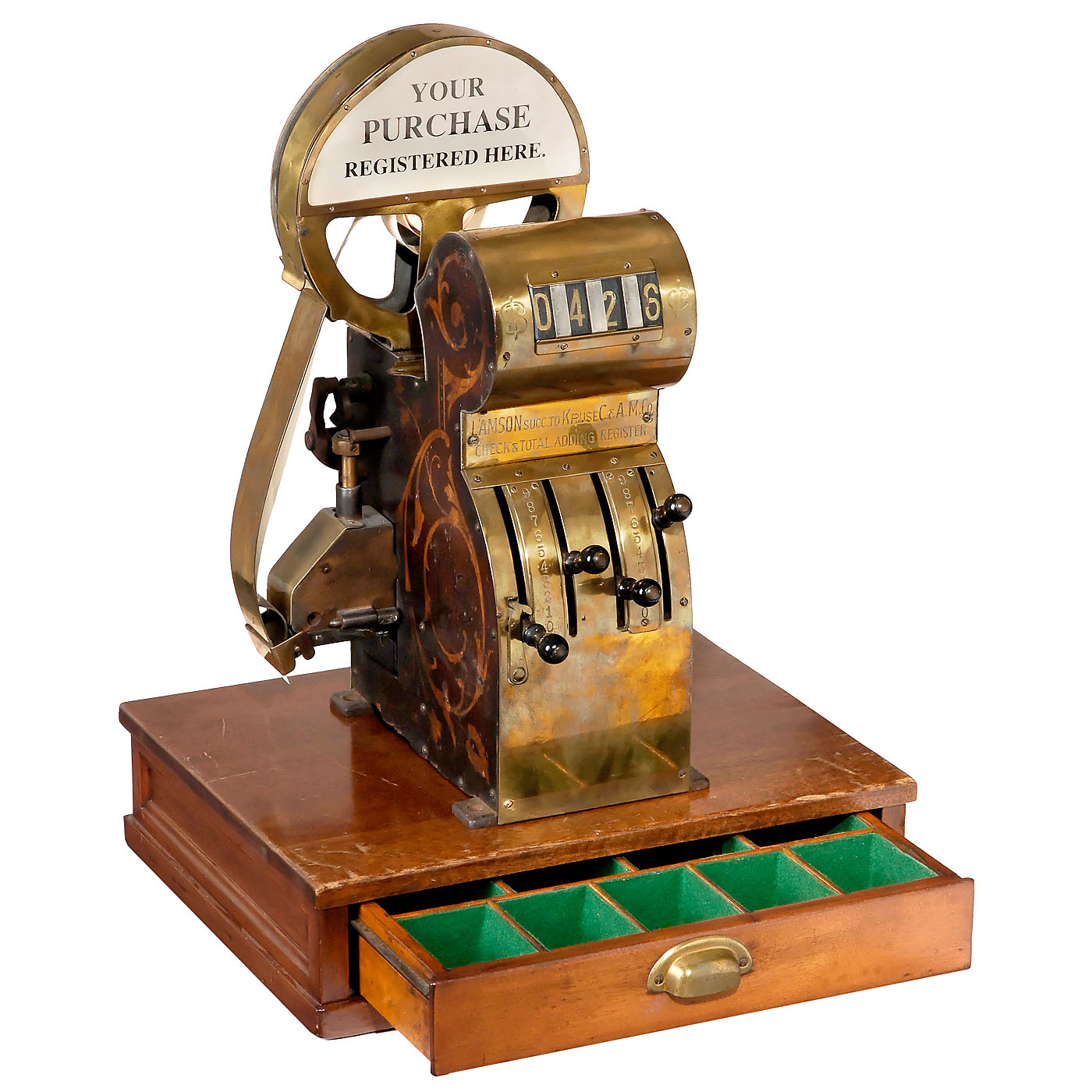 "Lamson Succ. To Kruse C. & A.M. Co.", serial no. 895, American lever-type cash register with printer, brass front, elaborate inlaid wood sides. A rare cash register in original condition, on later cash register drawer, c. 1920.