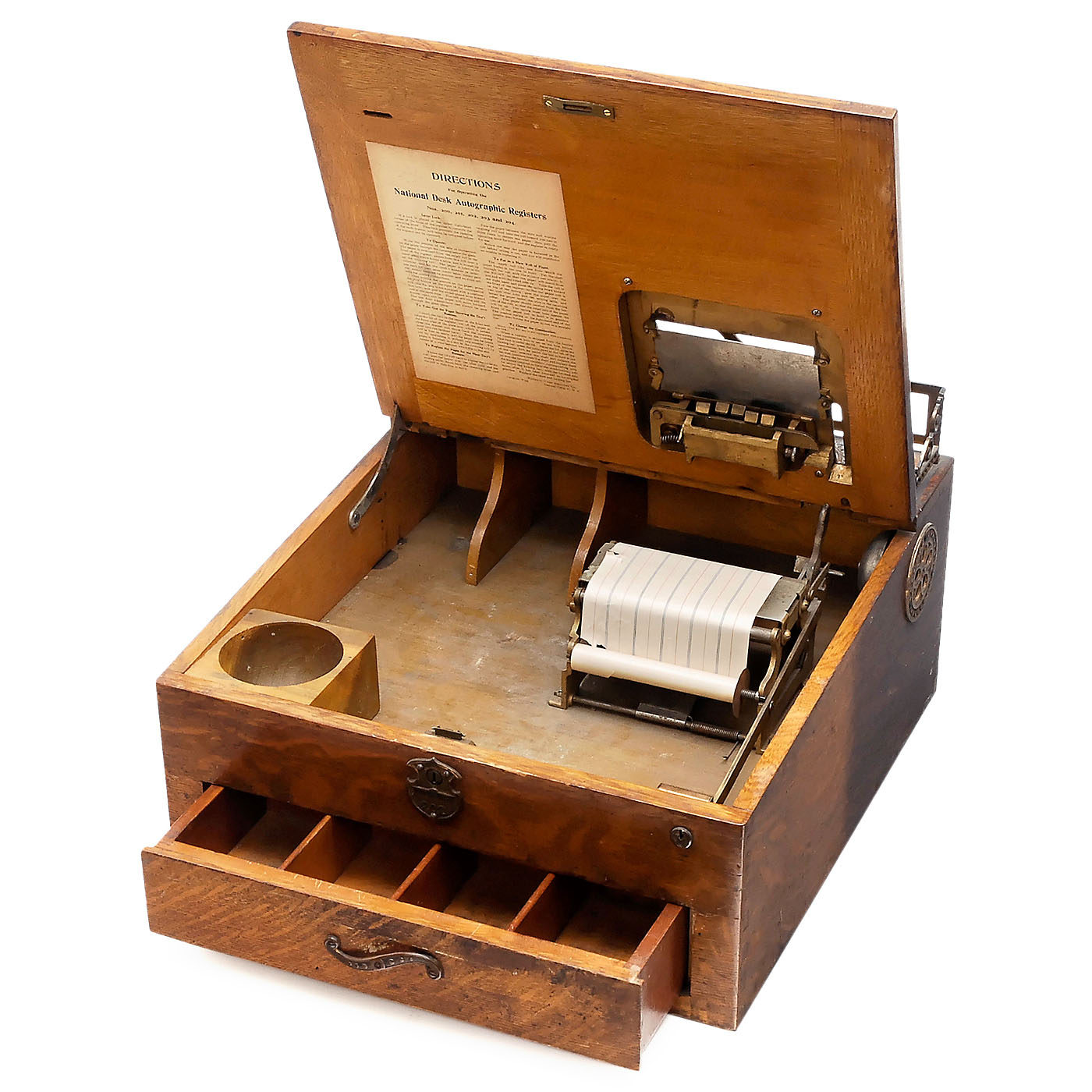 National Cash Register Company, Dayton, USA. Serial no. 190843, oak and brass, with paper strip, inkwell compartment and cash drawer, size 17 1/3 x 19 x 12 ¼ in.
