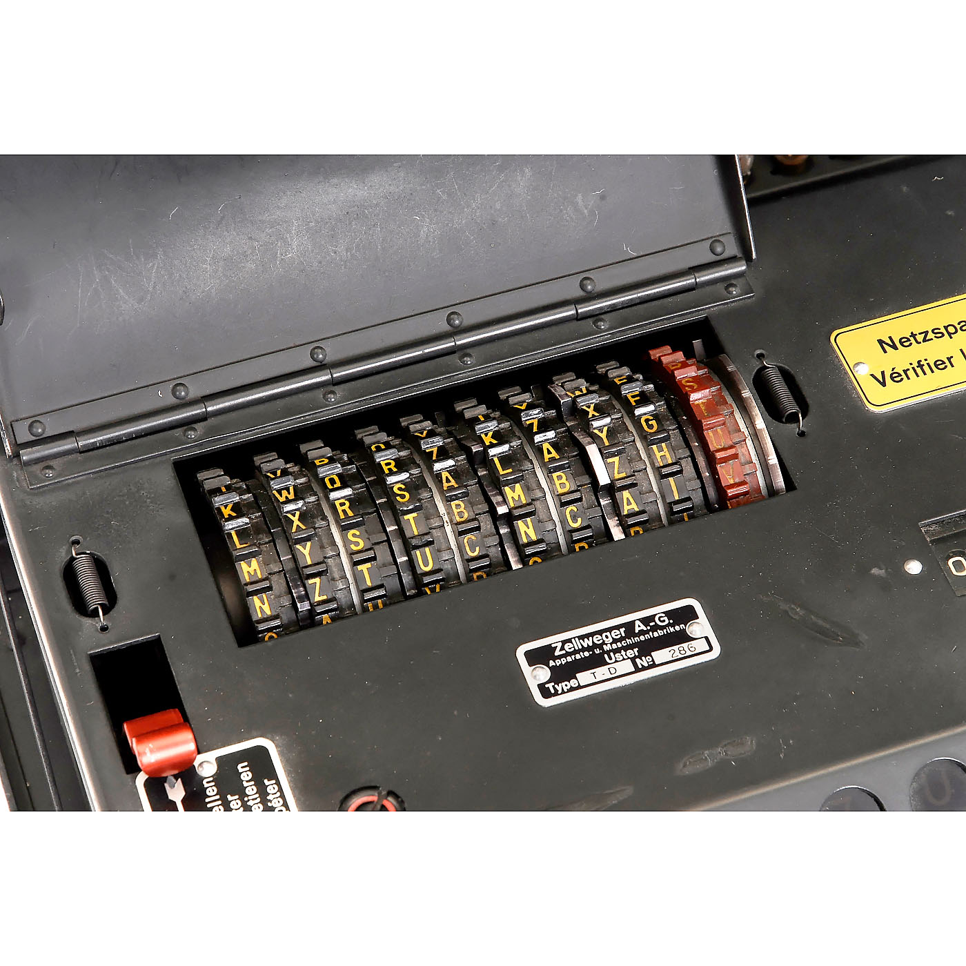 Nema T-D ciphering machine by Zellweger A.G., Uster, Switzerland. No. 286, rare 10-rotor successor of the legendary "Enigma" WWII ciphering machine, produced exclusively for the Swiss army. Only 640 examples of this rare machine were made and it was never marketed officially. With cord, extra lamps, key and an extra lamp panel. - A great collector's item and exhibition piece.