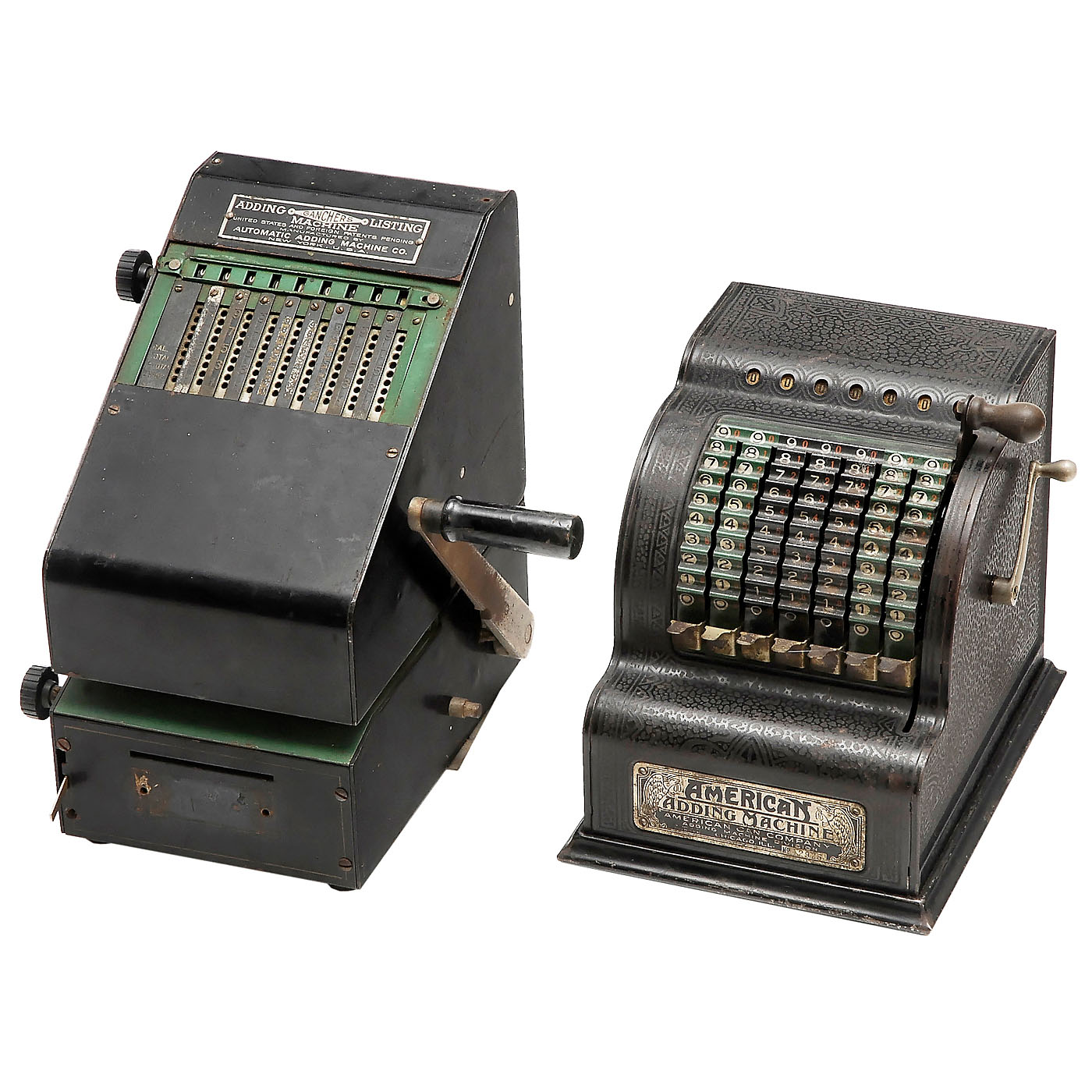 1) Comptometer, 12-digit adder with copper-tin case, working. - 2) American Adding Machine, model 1, working. - 3) Plus Adder, model 909, defective. - And: 4) Ganchers adder with printer, mechanism sticks.