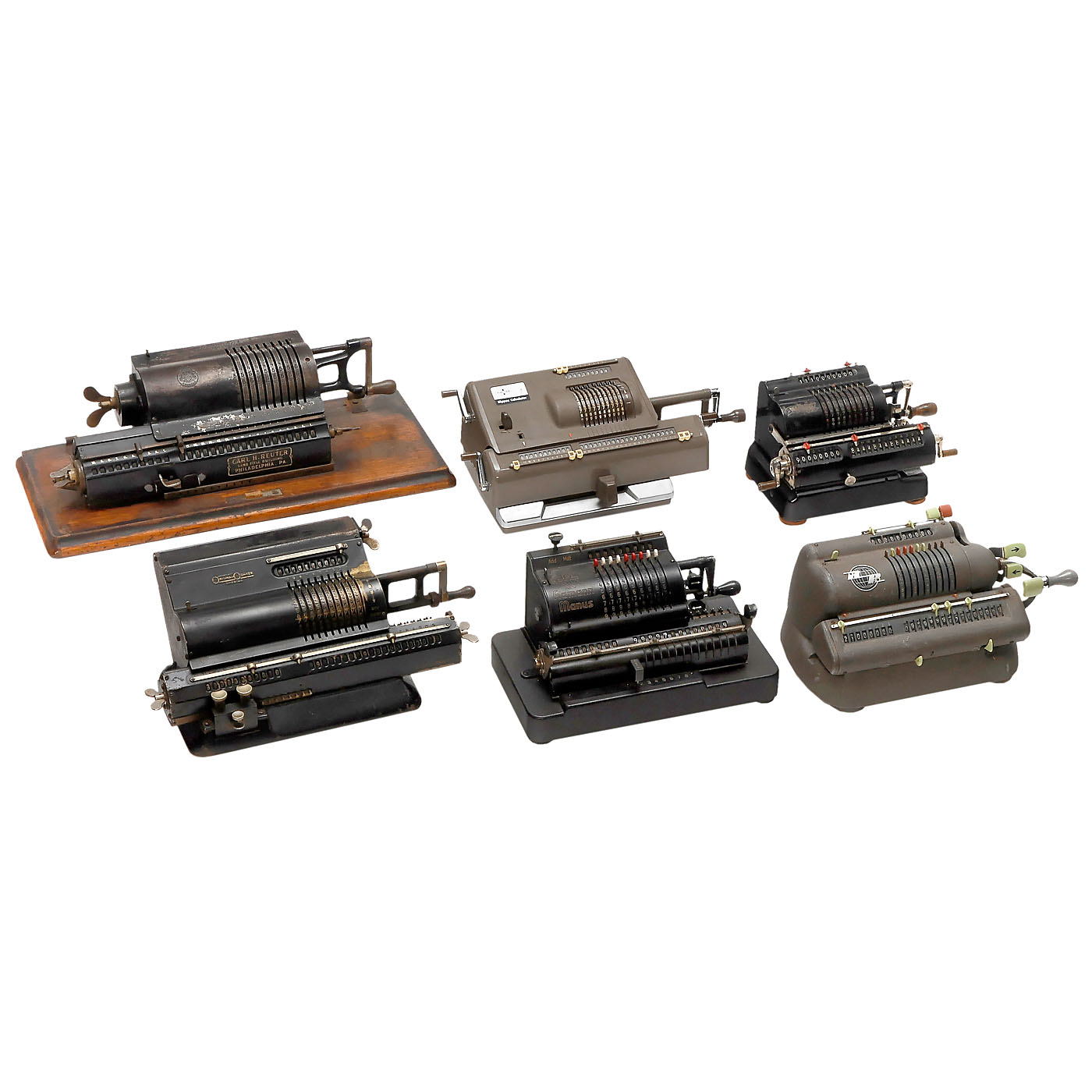 1) Brunsviga, model A, 9, 10 and 18 digits, working, serial no. 12186, c. 1900. (3-4/3) - 2) Walther, model RMKZ, 10, 8 and 13 digits, mechanism sticks, c. 1930. (3/5) - 3) Nippon Master Hand Calculator, model HL-21, Broughtons Calculator Ltd., 10, 11 and 21 digits, working, c. 1960. (2-3/2-3) - 4) Remington Rand, model R 540, US-Zone Germany, 10, 8 and 16 digits, mechanism sticks, c. 1950. (3/5) - 5) Original-Odhner, 10, 11 and 20 digits, c. 1920. (3/3) - And: 6) Hamann Manus, model E, 9, 8 and 13 digits, working, c. 1940. (2-3/2-3)