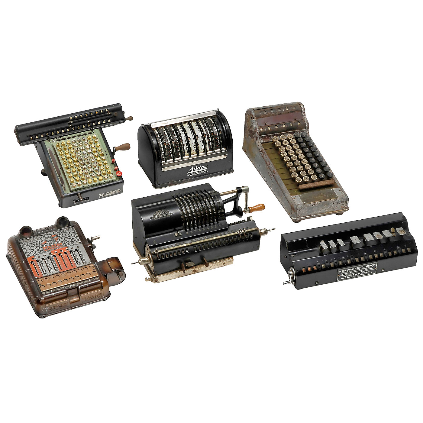 1) Monroe, model D, 1915, keyboard adder, Monroe Calculating Machine Company, New York. Serial no. 2277, working. (2-3/2) - 2) Master Multiscriptor, 1934, addiator, Belgium, with illumination and interim result notation device (not complete), working. (3/2-3) - 3) Mechanical Accountant, model H, 1901 onwards, USA. Serial no. 11302, mechanism sticks. (4-5/4-5) - 4) Addac, 1924, coaxial dial adder for American currency, Addac Company, Grand Rapids, USA. Serial no. 1369, working. (3/2) - 5) Marbel's Blood-Cell Calculator, c. 1921, Chicago. Serial no. 7693, working. (3/2) - And: 6) Arrow Calculator, 1920, spoked wheel, 9, 8 and 15 digits, New York, working. (3/2-3)