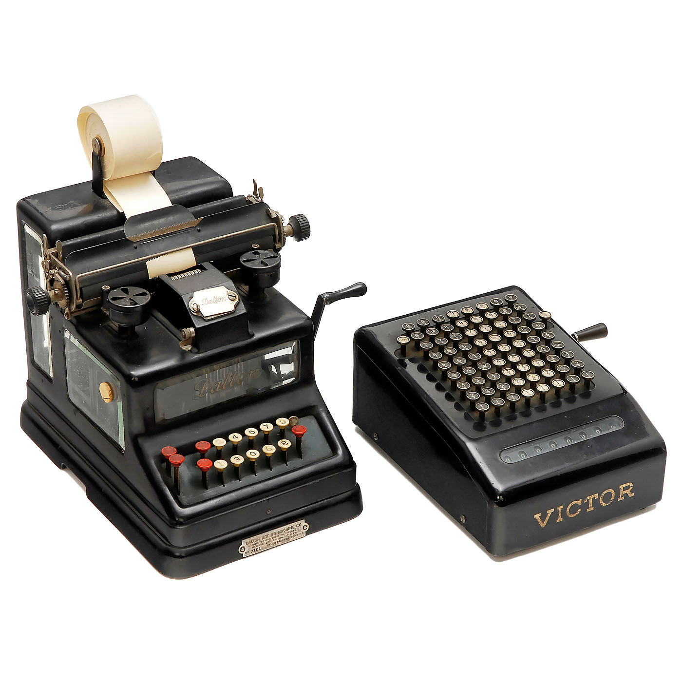 1) The Barrett No. 12, Barrett Adding Machine Co., Philadelphia. Serial no. 11249, with printer, working. - 2) The Sundstrand, General Office Equipment Corporation. With printer, defective. - 3) Victor 12, Victor Adding Machine Co., Chicago. Serial no. 1236, working. - And: 4) Dalton, model 1, serial no. 9101, with printer, working.