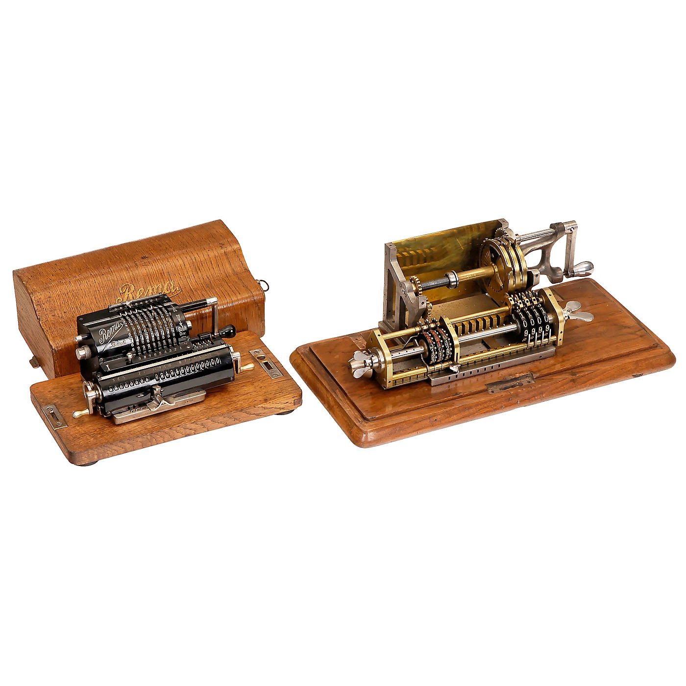 1) Rema I, Braunschweiger Rechenmaschinenfabrik Rema G.m.b.H., serial no. 1420, 9, 8 and 13 digits, with wood base and lid, works very well. - And: 2) Dactyle, Chateau Frères, 4 Rue Lafayette, Paris. Working cutaway model of the French spoke-wheel calculator.