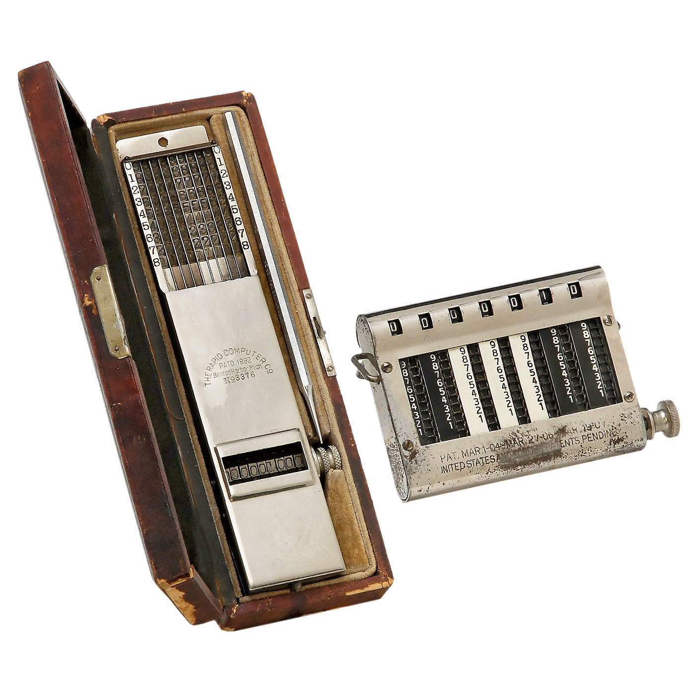 1) The Rapid Computer, 1892. Early 9-digit American thrust-action adder in original case, with pen. Made by The Rapid Computer Company, Benton Harbor, Mich., USA. - Literature: Martin, pp. 125 and 231. - And: 2) Golden Gem, 1904. 7-digit chain adder with tens transfer in original leather box (worn). - Literature: Martin, p. 155.