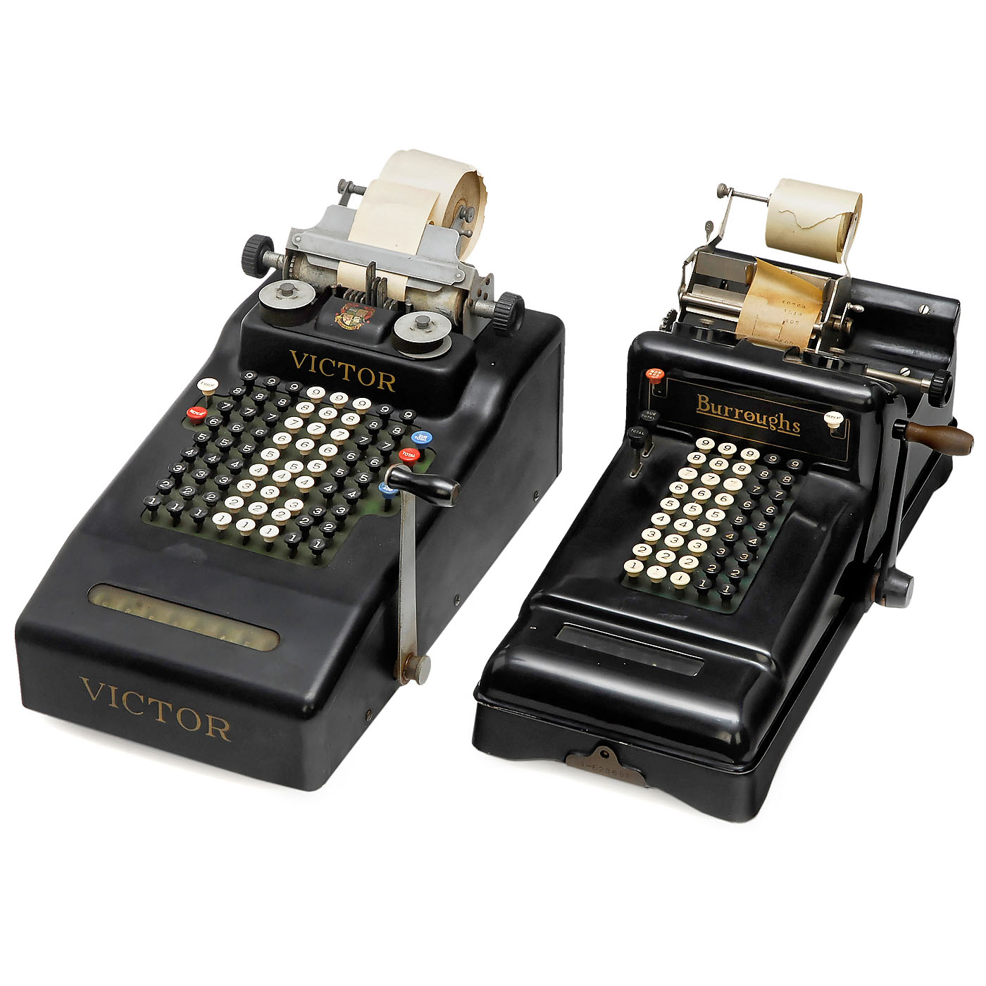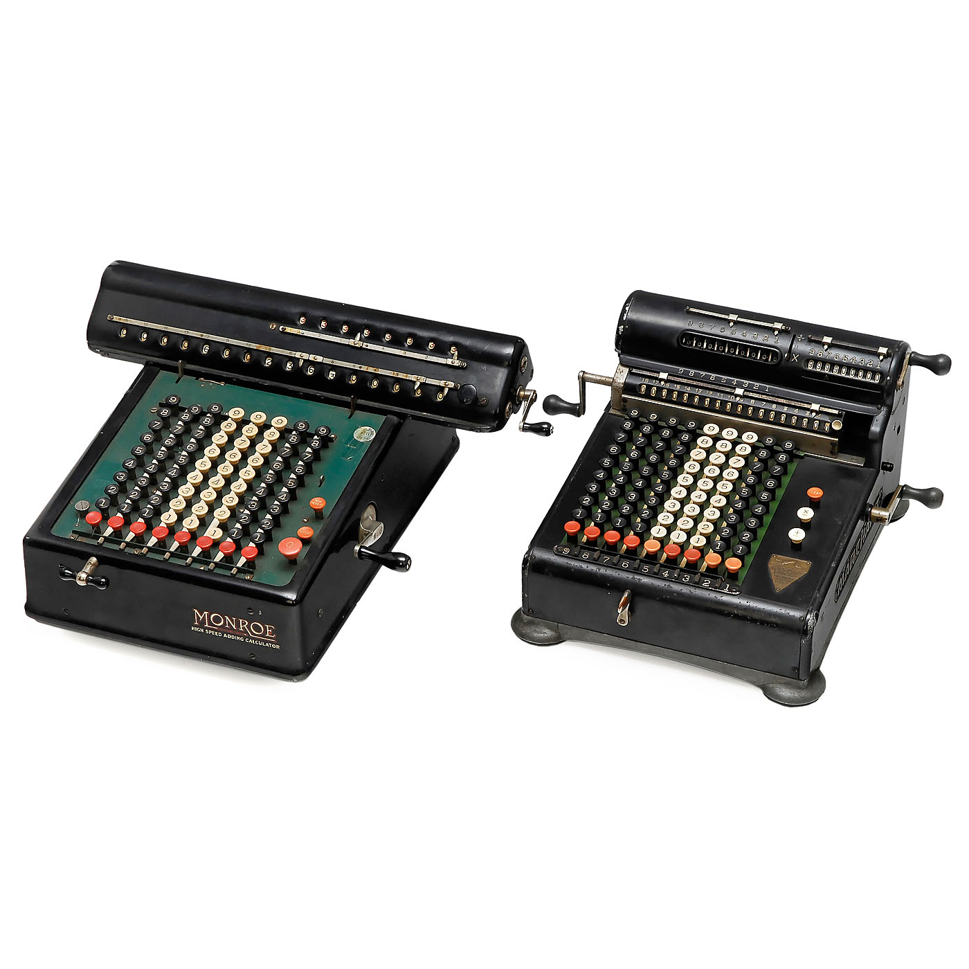 1) Burroughs Adder model L301, no. 628696, with printer, working. (2-3/2) - 2) Victor Adder model 6, no. 320805, with printer, mechanism sticks. (3/5) - 3) Monroe High Speed Adder, mechanism sticks. (3/5) - And: 4) Marchant model KC, no. 5254, mechanism sticks. (3/5)