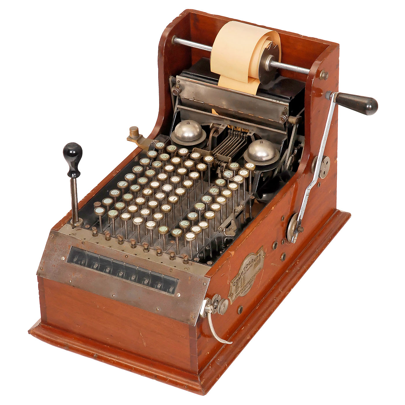 Printing adding machine, invented and patented by Dorr E. Felt, manufactured by Felt & Tarrant Mfg. Co., Chicago, first version in wood case!