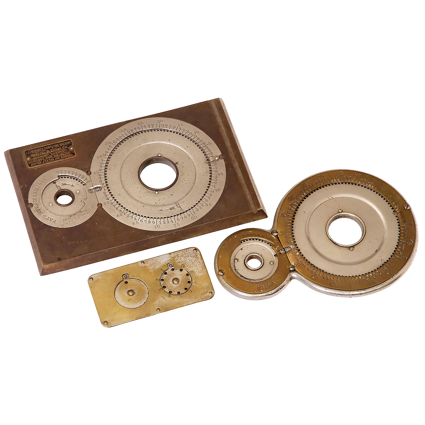 1) "Victor Adder", 2-disc adder with tens transfer, Webb-type, nickeled brass. - 2) "Herring's Computing Machine", manufactured by Keuffel & Esser, train resistor, cast-iron base. - And: 3) "Stephenson Adder", model A, pocket size, for sums up to 199, c. 1890.