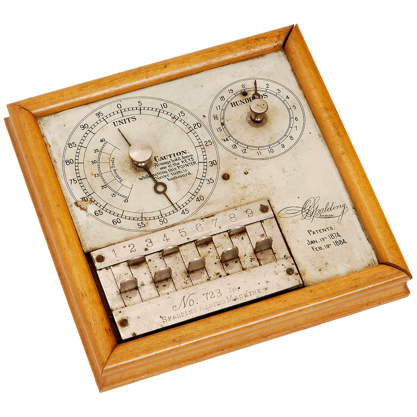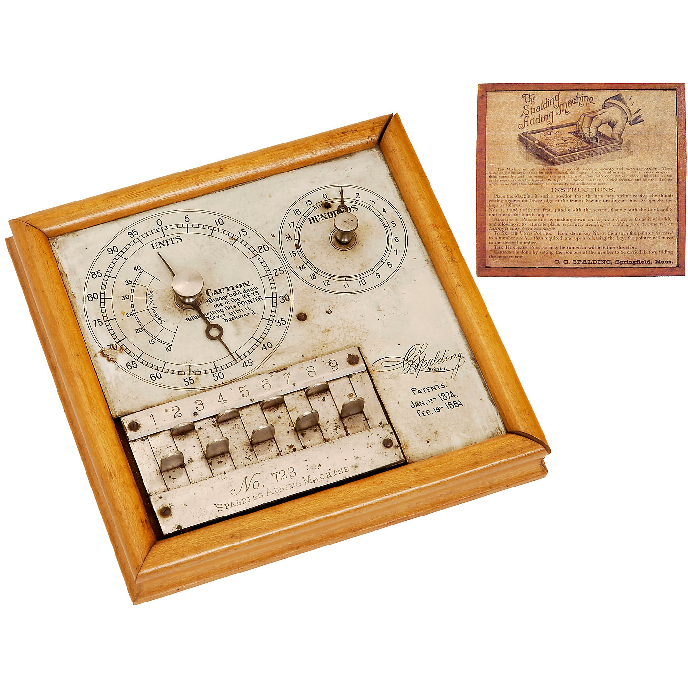 Early American adding machine by Cyrus G. Spalding, Boston, MA. U.S. patents of Jan. 13, 1874 (no. 146407) and Feb. 19, 1884 (no. 293809). Serial no. 723. - Literature: Martin, p. 92. - Good condition! - Only 7 known! One of the most desirable office antiques!