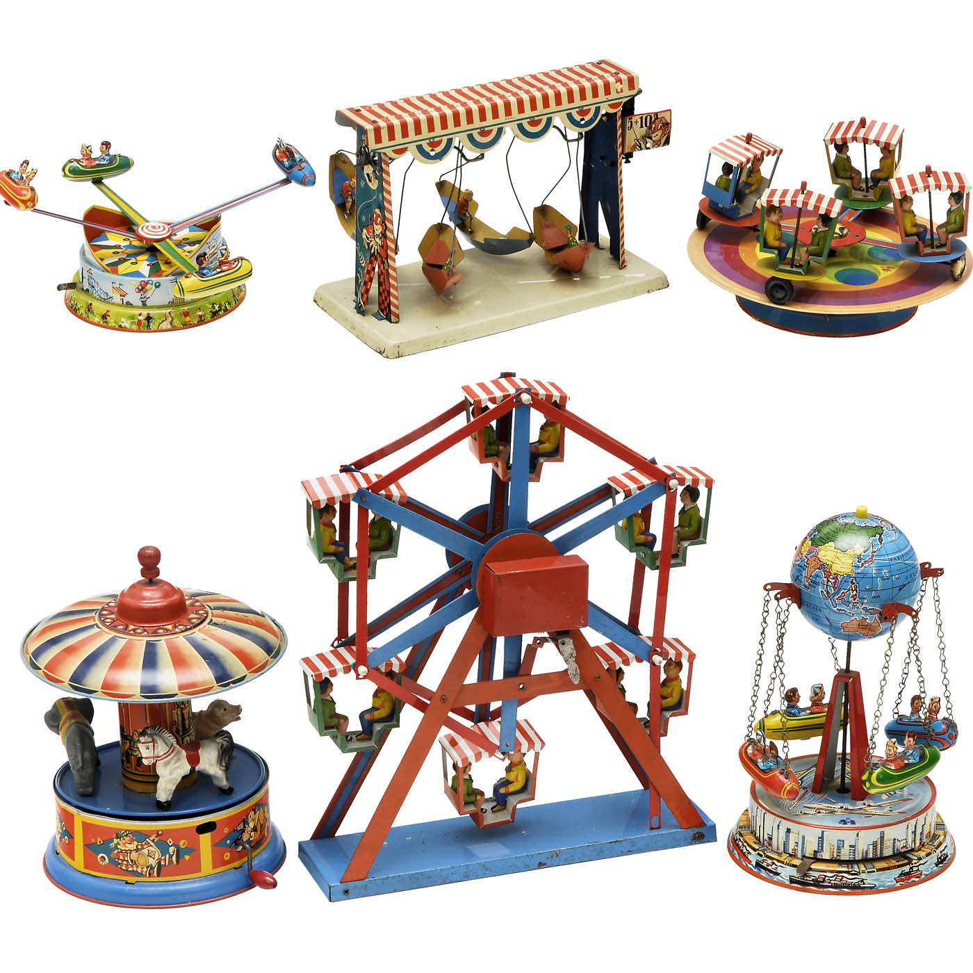 1) Blomer & Schüler, flying rockets no. 550. - 2) Rohrseitz, 3 plastic animal figures, simple musical movement. - 3) Blomer & Schüler, 4 turning gondolas. - 4) Blomer & Schüler, chairoplane. - 5) Adolf Brückner, swing boat. - And: 6) Blomer & Schüler, Ferris wheel. - All working.