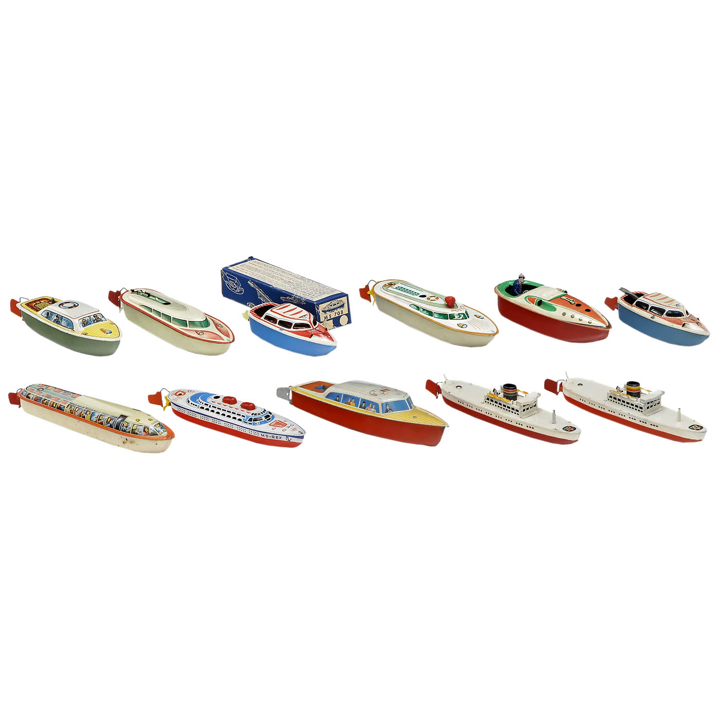 Manufactured by Arnold, CKO (Kellermann) and Michael Seidel. Lithographed tin, 9 spring-driven, 2 with spirit burner, length up to 10 in.