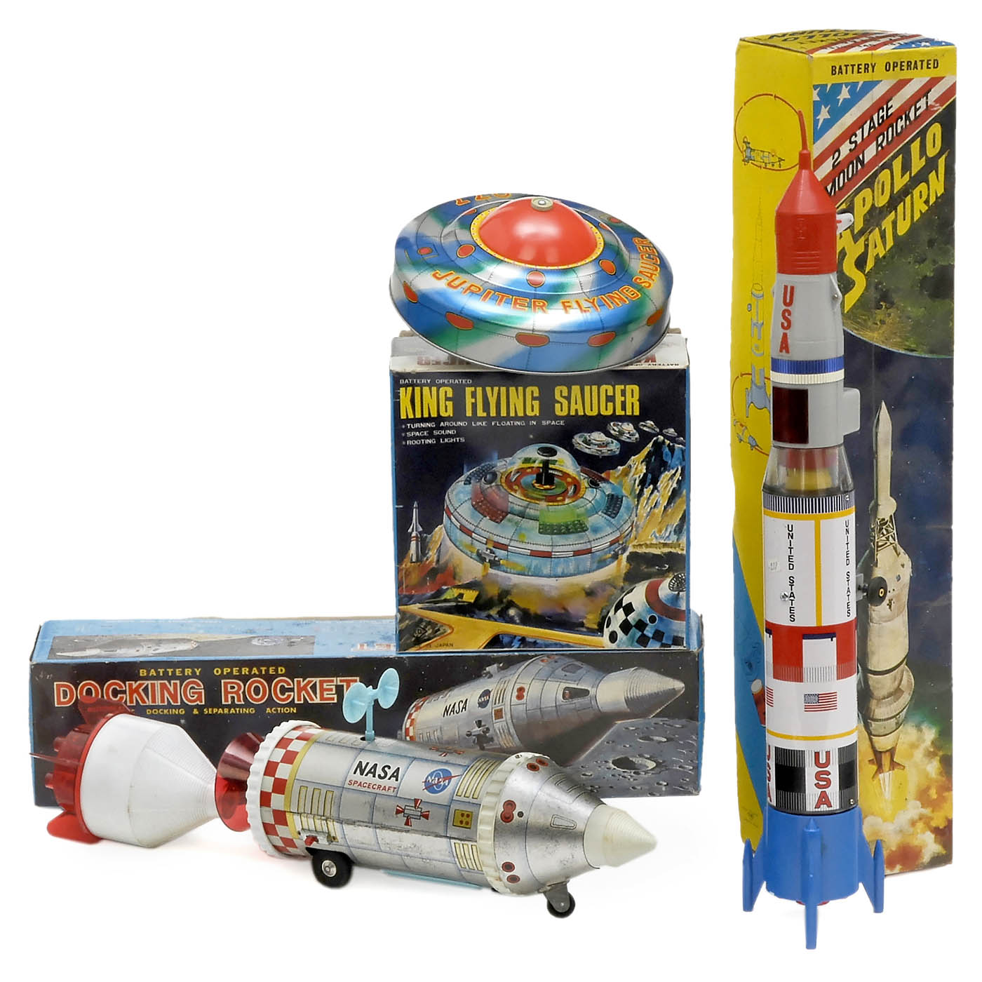 Lithographed tin and plastic. 1) Docking Rocket, Daiya Toys, battery (untested), length 16 ½ in. - 2) King Flying Saucer, Yoshiya K.O. Toys, battery (untested), Ø 7 in. - And: 3) Apollo Saturn, Nomura Toys, battery (untested), length 20 ½ in. - All in original boxes.