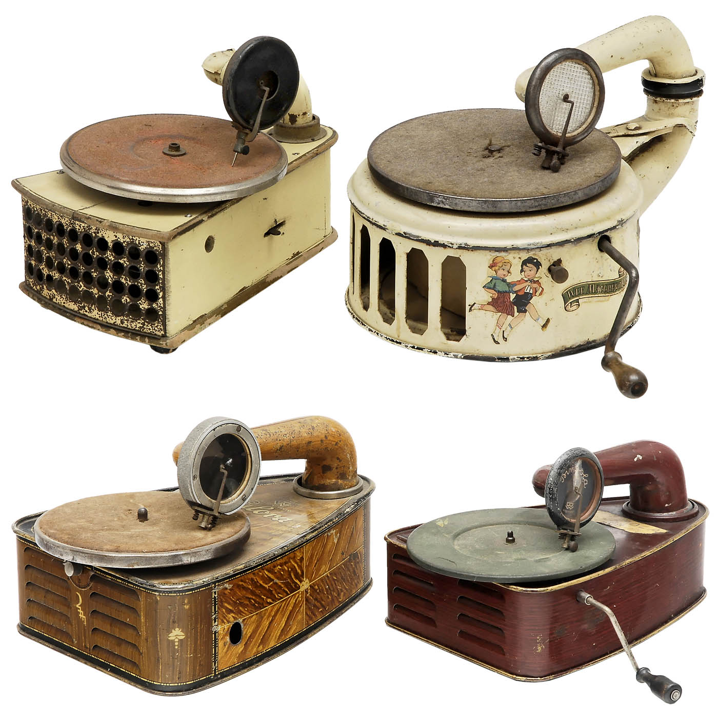 1) Pygmola, probably Bing Werke, Nuremberg. Lithographed tin, spring-driven, working. - 2) Unmarked, Germany. Japanned wood case, spring-driven, working. - And: 3) Valora, Bing Werke, Nuremberg. Lithographed tin, spring-driven, untested. - And: 4) Wee Maggregor (Induphon), "Industria" Blechwarenfabrik G.m.b.H., Berlin. Beige-lacquered metal case with decals, spring-driven, working. - With 2 cranks.