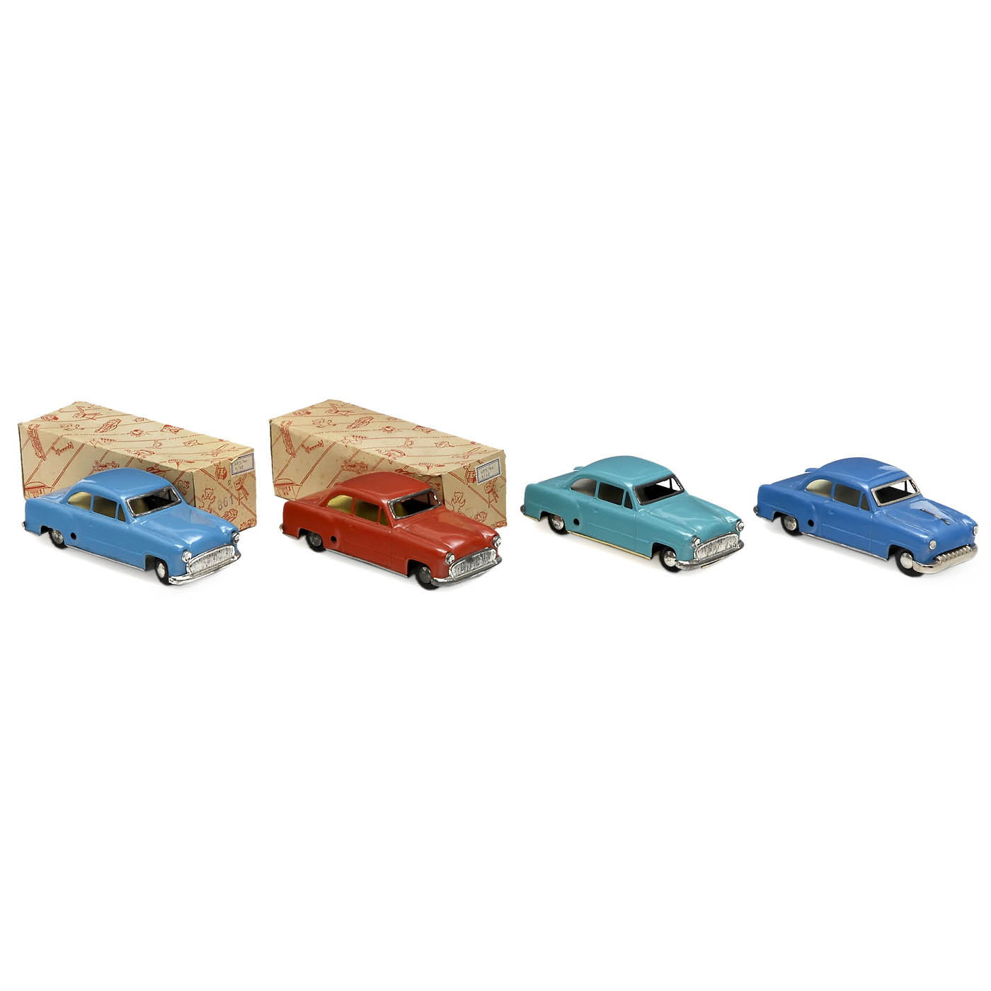 Siegfried Günthermann, Nuremberg. Embossed tin, spring-driven (all working), 7 2/5 in. each. 1) Opel Rekord P1, blue, original box. - 2) Opel Rekord P1, turquoise. - 3) Opel Olympia, with shark-shape radiator grill, blue. - And: 4) Opel Rekord P1, red, original box.