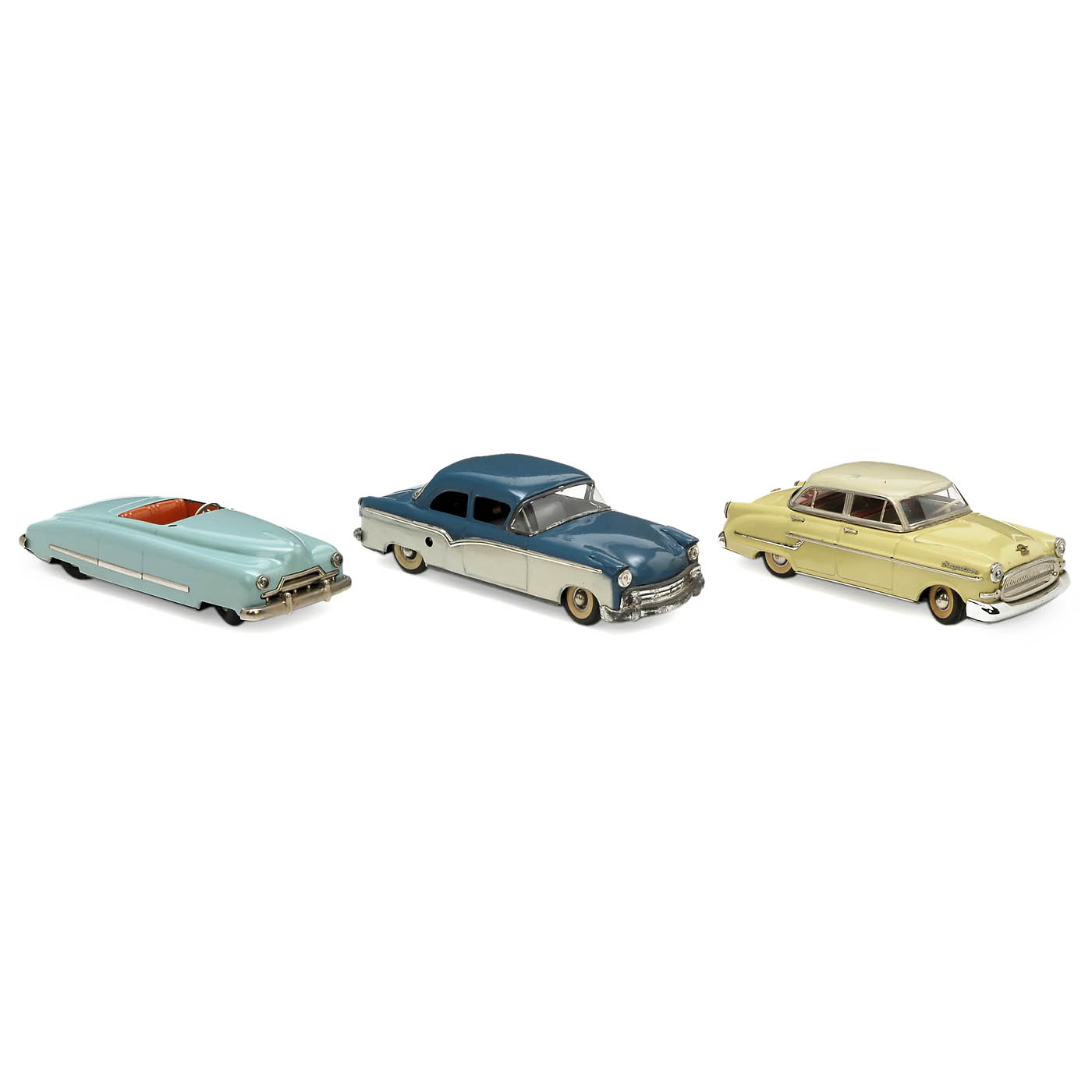 1) Ford, Siegfried Günthermann, Nuremberg. Lacquered tin, spring-driven (working), length 10 5/8 in. - 2) Opel Kapitän, Gama 400, Georg Adam Mangold, Fürth. Yellow-and-beige-painted tin, lithographed interior, friction (working), length 9 7/8 in. - And: 3) Telecar, JNF, Josef Neuhierl, Fürth, Germany. Green-lacquered, lithographed interior, working spring-motor, without windscreen and remote control, length 10 1/5 in.