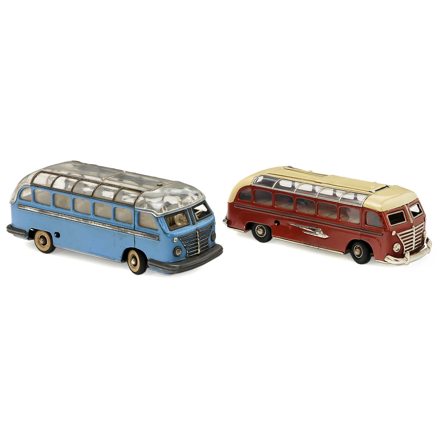 Siegfried Günthermann, Nuremberg. 1) Bus (Amsterdam - Rome) no. 29, c. 1952, marked "Made in US-Zone Germany", lithographed tin, spring-driven (working), forward and reverse, sliding roof, baseplate with lithographed map, rubber tyres, length 11 in. (2/2) - And: 2) Setra bus no. 858, c. 1960, spring-driven (working), Perspex roof with crack at the rear, driver figure, length 11 2/5 in. (4/2-3)