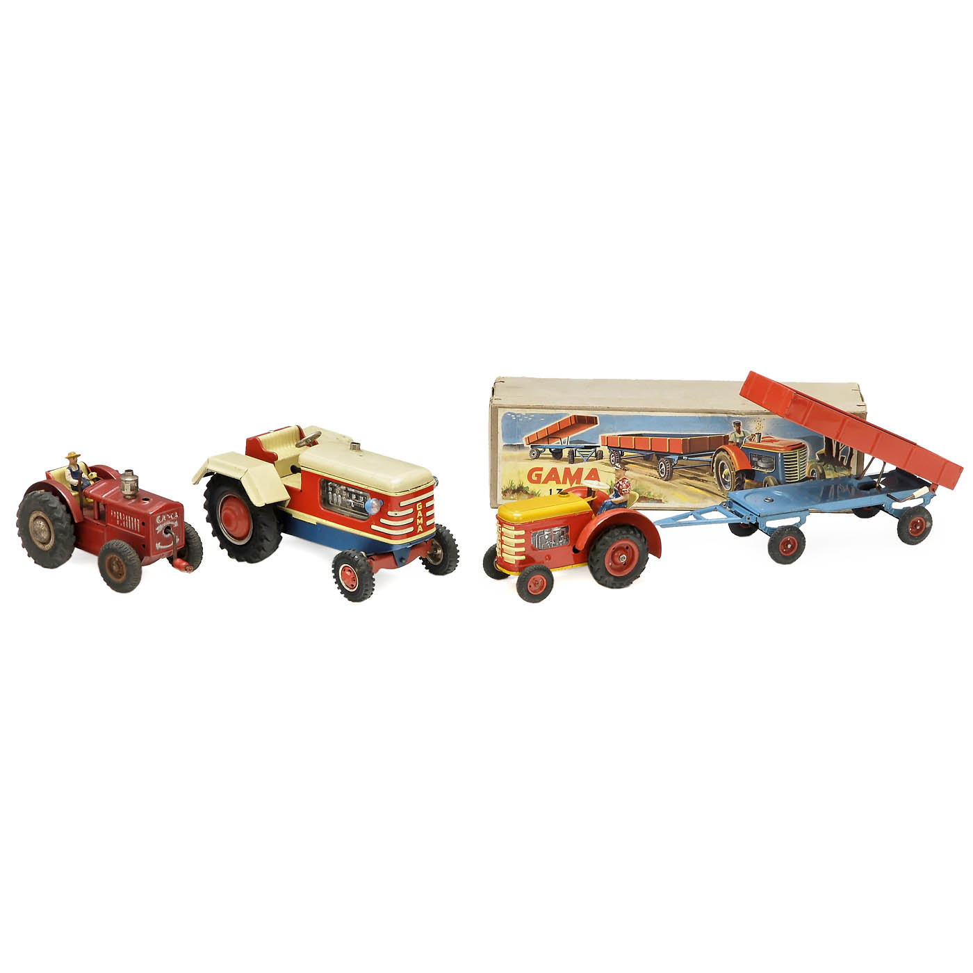 1) No. 176/4, with trailer, spring-driven (working), 14 1/5 in., original box. - 2) No. 178/2, with crank, spring-driven, working, 7 4/5 in., with driver figure. - And: 3) No. 800/1, spring-driven (working), no chimney, visible motor, 8 ¾ in.