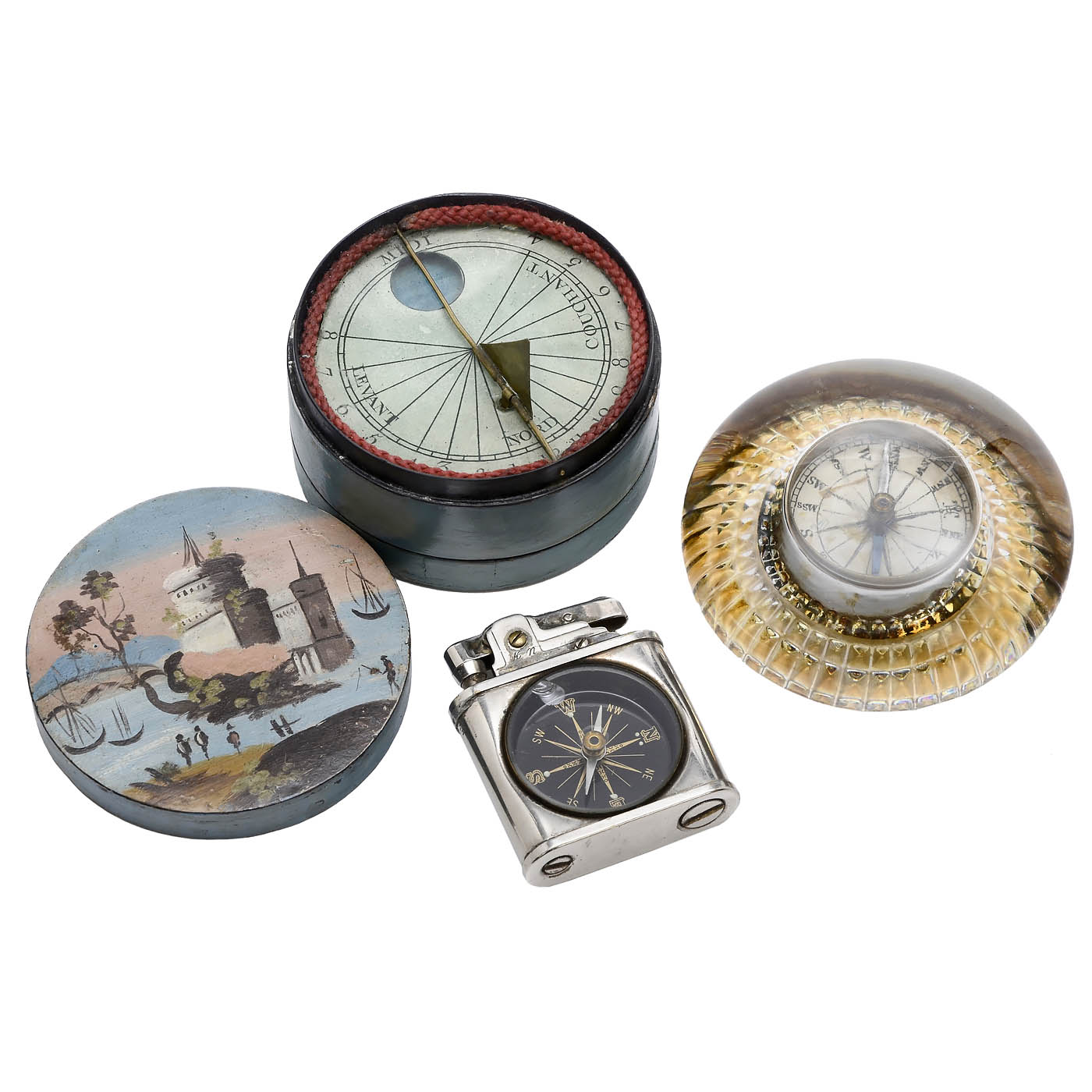 1) Paperweight, glass, Ø 3 1/6 in., weight 350 g, c. 1920-30. - 2) Lighter, nickeled, c. 1935. - And: 3) Sundial with compass, painted wood case, with lid and base compartment, Ø 3 in., early 20th century.