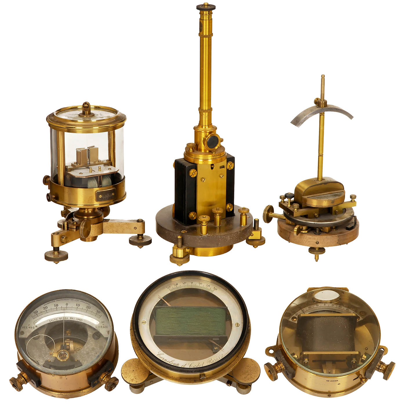 1) Mirror galvanometer, 1897 onwards, no. 48916, manufactured by Siemens & Halske, original lacquered brass, ebonite base, height 14 ½ in. - 2) Galvo No. 24A, dated 1940, Cambridge Instrument Co. Ltd. England, No. 696, original lacquered brass, Ø 4 in. - 3) Special instrument, late 19th. century, "Aterierul de Telegrafie", brass, wood base, height 10 5/8 in. - 4) Universal galvanometer, c. 1890, Siemens & Halske, Berlin, no. 30136, original lacquered brass, cord torn, otherwise in good condition, height 8 ¾ in. - 5) Needle galvanometer, c. 1910, H.W. Sullivan, no. 2068, original lacquered brass, Ø 4 in. - And: 6) French needle instrument, c. 1890, brass, silver scale, Ø 4 ¾ in.